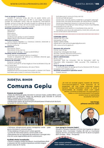 WWW.GHIDULPRIMARIILOR.RO JUDE%u021aUL BIHOR / 105Cum se ajunge in localitate:Accesul %u00een comuna Giri%u015fu de Cri%u015f se poate realiza prin intermediul c%u0103ilor rutiere prin DJ 797 A, care leag%u0103 Municipiul Oradea de localitatea Inand. Fa%u0163%u0103 de Aeroportul Interna%u0163ional Oradea, comuna Giri%u015fu de Cri%u015f este situat%u0103 la o distan%u0163%u0103 de circa 15,5 km. %u00cen comuna Giri%u0219u de Cri%u0219 se poate ajunge %u0219i din drumul european E60 Bor%u0219 pe drumul comunal 74.Activitati economice si specifice zonei:Agricultur%u0103ZootehniePiscicultur%u0103Mica industrieConfec%u0163ionare garduri %u0219i por%u021bi metalice Abator pentru sacrificare a cabalinelorObiective turistice:Lunca Cri%u015fului Repede %u0219i a Canalului colector, bisericele %u0219i siturile arheologice din comun%u0103Muzeul comunalEvenimente:Ziua satului T%u0103rianZiua satului Giri%u0219u de Cri%u0219 Concurs anual de box - %u201dCupa GLADIATORUL%u201dFacilit%u00e3%u0163i oferite investitorilor:Scutiri de taxe %u0219i impozite pentru investitori Punere la dispozi%u021bie de terenuri cu utilit%u0103%u021bile aferente (gaz, electricitate, ap%u0103-canal, asfalt)Proiecte de investi%u0163ii:Proiecte %u00een derulare:Drumul comunal 74 ce face leg%u0103tura %u00eentre localitatea%u00a0Giri%u0219u de Cri%u0219 %u0219i Vama Bor%u0219Canalizare pe strada Nordului, din satul T%u0103rianProiecte de viitor:Reabilitare termic%u0103 la %u0218coala Gimnazial%u0103 cu clasele I-VIII T%u0103rianExtindere ap%u0103 %u0219i canal, %u00een comuna Giri%u0219u de Cri%u0219Extindere gaz %u00een comuna Giri%u0219u de Cri%u0219Construire sal%u0103 de sportConstruirea unei s%u0103li, pentru Gr%u0103dini%u021ba cu program prelungitConstruirea unei piste de biciclet%u0103, din S%u00e2ntandrei la ToboliuConstruire (reparare) trotuare, %u00een comuna Giri%u0219u de Cri%u0219Amenajarea unei plaje pe malul st%u00e2ng al r%u00e2ului Cri%u0219ul Repede, %u00een localitatea Giri%u0219u de Cri%u0219Amenajarea unei pesc%u0103rii, %u00een localitatea Giri%u0219u de Cri%u0219Acordarea unor locuri de cas%u0103 pentru tinerii din comun%u0103, care vor s%u0103 construiasc%u0103 case familiareCOMUNA GEPIUAdres%u0103: DN 79, nr. 80Cod po%u0219tal: 417149Telefon: 0259-479318; Adresa de e-mail: primaria.gepiu@yahoo.com URL: www.comuna-gepiu.roPersoane din primarie:Primar: Ioan%u00a0PurgeViceprimar: Gheorghe Dan%u00a0Bu%u0219eSecretar General: Ramona Corina%u00a0Iancu%u00a0Contabil: Szab%u00f3%u00a0Marinela AugustinaSate %u00een administra%u021bie:Bicaci, GepiuSuprafa%u021ba:%u00a0 4103 ha; Intravilan:%u00a0 318 ha; Extravilan:%u00a0 4237 ha; Popula%u021bia:%u00a0 2216; Gospod%u0103rii:%u00a0 1080; Locuin%u021be:%u00a0 772; Gr%u0103dini%u021be:%u00a0 2; %u0218coli:%u00a02; Cum se ajunge in localitate:%u00cen comuna Gepiu se ajunge pe Drumul Na%u021bional DN 79, drum european E 671 Oradea-Arad.Activitati economice si specifice zonei:Prest%u0103ri servicii