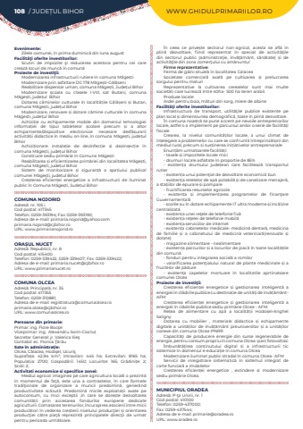 108 / JUDE%u021aUL BIHOR WWW.GHIDULPRIMARIILOR.ROEvenimente:Zilele comunei, %u00een prima duminic%u0103 din luna augustFacilit%u00e3%u0163i oferite investitorilor:Scutiri de impozite %u015fi reducerea acestora pentru cei care creaz%u0103 locuri de munc%u0103 %u00een comun%u0103Proiecte de investi%u0163ii:Modernizarea infrastructurii rutiere %u00een comuna M%u0103ge%u0219tiModernizare prin asfaltare DC 178 M%u0103ge%u0219ti-G%u0103l%u0103%u0219eniReabilitare dispensar uman, comuna M%u0103ge%u0219ti, Jude%u021bul BihorModernizare %u0219coala cu clasele I-VIII, sat Butani, comuna M%u0103ge%u0219ti, jude%u021bul%u00a0%u00a0BihorDotarea c%u0103minelor culturale %u00een localit%u0103%u021bile G%u0103l%u0103%u0219eni %u0219i Butan, comuna M%u0103ge%u0219ti, jude%u021bul BihorModernizare, renovare %u0219i dotare c%u0103mine culturale %u00een comuna M%u0103ge%u0219ti, jude%u021bul BihorAchizi%u021bie cu echipamente mobile din domeniul tehnologiei informa%u021biei de tipul tabletelor %u0219colare precum %u0219i a altor echipamente/dispozitive electronice necesare desf%u0103%u0219urarii activit%u0103%u021bii didactice %u00een mediu on-line, %u00een comuna M%u0103ge%u0219ti, jude%u021bul BihorAchizi%u021bionare instala%u021bie de dezinfec%u021bie %u0219i dezinsec%u021bie %u00een comuna M%u0103ge%u0219ti, jude%u021bul BihorConstruire sediu prim%u0103rie %u00een Comuna M%u0103ge%u0219tiReabilitarea %u0219i eficientizarea prim%u0103riei din localitatea M%u0103ge%u0219ti, comuna M%u0103ge%u0219ti, jude%u021bul BihorSistem de monitorizare %u0219i siguran%u021b%u0103%u00a0 a spa%u021biului publical comunei M%u0103ge%u0219ti, jude%u021bul BihorCre%u0219terea eficien%u021bei energetice a infrastructurii de iluminat public %u00een Comuna M%u0103ge%u0219ti, Jude%u021bul BihorCOMUNA NOJORIDAdres%u0103: nr. 105 iCod po%u0219tal: 417345Telefon: 0259-393194; Fax: 0259-393190; Adresa de e-mail: primaria.nojorid@yahoo.comprimaria.nojorid@cjbihor.roURL: www.primarianojorid.roORA%u0218UL NUCETAdres%u0103: Republicii, nr. 8Cod po%u0219tal: 415400Telefon: 0259-339422, 0259-339407; Fax: 0259-339422; Adresa de e-mail: primaria.nucet@cjbihor.roURL: www.primarianucet.roCOMUNA OLCEAAdres%u0103: Principal%u0103, nr. 35Cod po%u0219tal: 417355Telefon: 0259-310881; Adresa de e-mail: registratura@comunaolcea.roprimaria.olcea@cjbihor.roURL: www.comunaolcea.roPersoane din primarie:Primar: ing. Flore Boc%u015feViceprimar: ing. %u00a0Alexandru Sorin Cioclu%u021bSecretar General: jr. Valerica Ilie%u015fContabil: ec. Florica %u0162%u0103r%u0103uSate %u00een administra%u021bie:Olcea, C%u0103lacea, Hodi%u015fel, Ucuri%u015fSuprafa%u021ba:%u00a0 42,94 km%u00b2; Intravilan:%u00a0 445 ha; Extravilan:%u00a0 8165 ha; Popula%u021bia:%u00a0 2700; Gospod%u0103rii:%u00a0 1450; Locuin%u021be:%u00a0 165; Gr%u0103dini%u021be:%u00a0 2; %u0218coli:%u00a02; Activitati economice si specifice zonei:Mediul agricol: imaginea pe care agricultura local%u0103%u00a0o prezint%u0103 %u00een momentul de fa%u0163%u0103, este una a contrastelor, %u00een care formele tradi%u0163ionale de organizare a muncii predomin%u0103, gener%u00e2nd productivitate sc%u0103zut%u0103. Predomin%u0103%u00a0 micile exploata%u021bii axate pe autoconsum, cu mici excep%u021bii ,%u00een care se dore%u0219te dezvoltarea comunit%u0103%u021bii prin accesarea fondurilor europene dedicate agriculturii. Comasarea terenurilor, %u00eencurajarea asocierii %u00eentre micii produc%u0103tori %u00een vederea cre%u0219terii nivelului produc%u0163iei %u0219i orientarea produc%u0163iei c%u0103tre pia%u0163%u0103 reprezint%u0103 principalele direc%u0163ii de urmat pentru perioada urm%u0103toare.%u00cen ceea ce prive%u0219te sectorul non-agricol, acesta se afl%u0103%u00a0 %u00een plin%u0103%u00a0 dezvoltare, fiind reprezentat %u00een special de activit%u0103%u0163ile din sectorul public (administra%u0163ie, %u00eenv%u0103%u0163%u0103m%u00e2nt, s%u0103n%u0103tate) %u0219i de activit%u0103%u0163ile din zona comer%u0163ului cu am%u0103nuntulFirme reprezentative:Ferma de g%u0103ini situat%u0103%u00a0%u00een localitatea CalaceaSocietate comercial%u0103 axat%u0103%u00a0 pe cultivarea %u0219i prelucrarea sorgului pentru maturiReprezentative la cultivarea cerealelor sunt mai multe societ%u0103%u021bi care lucreaz%u0103 %u00eentre 40ha- 500 ha teren arabil.Produse locale:Ardei pentru boia, m%u0103turi din sorg, miere de albineFacilit%u00e3%u0163i oferite investitorilor:Infrastructura de transport, utilit%u0103%u0163ile publice existente pe plan local %u0219i dimensiunea demografic%u0103, toate %u00een plin%u0103%u00a0dezvoltare.%u00cen comuna noastr%u0103%u00a0se pune accent pe nevoile antreprenorilor locale, astfel s-a implement pe parcursul anilor o serie de facilit%u0103%u021bi fiscaleCrearea, la nivelul comunit%u0103%u021bilor locale, a unui climat de %u00een%u021belegere a problemelor cu care se confrunt%u0103 %u00eentreprinz%u0103torii din mediul rural, precum %u0219i sus%u021binerea ini%u021biativelor antreprenorialeEnun%u021b%u0103m urmatoarele facilit%u0103%u021bi:- taxele %u0219i impozitele locale mici- drumuri locale asfaltate %u00een proportie de 85%- existen%u021ba drumului jude%u021bean care faciliteaz%u0103 transportul rutier- existen%u021ba unui poten%u0163ial de dezvoltare economic%u0103 bun- existen%u021ba retelelor de ap%u0103 potabil%u0103 %u0219i de canalizare menajer%u0103, a sta%u021biilor de epurare %u0219i pompare- fructificarea resurselor agricole- existen%u021ba %u0219i implementarea programelor de finan%u0163are Guvernamental%u0103- %u0219colile au %u00een dotare echipamente IT ultra moderne %u0219i %u00eenc%u0103lzire centralizat%u0103- existen%u021ba unei re%u0163ele de telefonie fix%u0103- existen%u021ba re%u0163elei de telefonie mobil%u0103- existen%u021ba serviciilor de internet- existen%u021ba cabinetelor medicale- medicin%u0103 dentar%u0103, medicina de familie %u0219i a cabinetului de medicin%u0103 veterinar%u0103(renovate %u0219i dotate)- magazine alimentare - nealimentare- ex