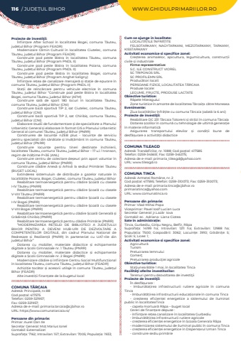 116 / JUDE%u021aUL BIHOR WWW.GHIDULPRIMARIILOR.ROProiecte de investi%u0163ii:%u00cenfiin%u021bare After School %u00een localitatea Bogei, comuna T%u0103uteu, jude%u021bul Bihor (Program FEADR)Modernizare C%u0103min Cultural %u00een localitatea Ciutelec, comuna T%u0103uteu, jude%u021bul Bihor (Program FEADR)Construire pod peste Bistra %u00een localitatea T%u0103uteu, comuna T%u0103uteu, jude%u021bul Bihor (Program PNDL II)Construire pod peste Bistra %u00een localitatea Poiana, comuna T%u0103uteu, jude%u021bul Bihor (Program PNDL II)Construire pod peste Bistra %u00een localitatea Bogei, comuna T%u0103uteu, jude%u021bul Bihor (Program Anghel Saligny)%u00cenfiin%u021bare re%u021bea de canalizare menajer%u0103 %u0219i sta%u021bie de epurare %u00een comuna T%u0103uteu, jude%u021bul Bihor (Program PNDL II)Sta%u021bii de re%u00eenc%u0103rcare pentru vehicule electrice %u00een comuna T%u0103uteu, jude%u021bul Bihor %u201cConstruie pod peste Bistra %u00een localitatea Bogei, comuna T%u0103uteu, jude%u021bul Bihor (AFM)Construire sal%u0103 de sport 180 locuri %u00een localitatea T%u0103uteu, comuna T%u0103uteu, jude%u021bul Bihor (CNI)Construire baz%u0103 sportiv%u0103 TIP 2, sat Ciutelec, comuna T%u0103uteu, jude%u021bul Bihor (CNI)Construire baz%u0103 sportiv%u0103 TIP 2, sat Chiribi%u0219, comuna T%u0103uteu, jude%u021bul Bihor (CNI)Elaborare studii de fundamentare %u0219i de specialitate a Planului Urbanistic General %u0219i elaborare %u00een format GIS a Planului Urbanistic General al comunei T%u0103uteu, jude%u021bul Bihor (PNRR)Construirea de locuin%u021be nZEB plus - locuin%u021be de serviciu pentru speciali%u0219ti din s%u0103n%u0103tate %u0219i %u00eenv%u0103%u021b%u0103m%u00e2nt %u00een comuna T%u0103uteu, jude%u021bul Bihor (PNRR)Construire locuin%u021be pentru tineri destinate %u00eenchirierii, localitatea T%u0103uteu, comuna T%u0103uteu, jude%u021bul Bihor %u2013 17 u.l. 1 tronson, regim de %u00een%u0103l%u021bime P+3E (ANL)Construire centru de colectare de%u0219euri prin aport voluntar %u00een comuna T%u0103uteu, jude%u021bul Bihor (PNRR)Construire cl%u0103dire Anex%u0103 %u0219i Arhiv%u0103 la sediul Prim%u0103riei T%u0103uteu (BUGET LOCAL)Extinderea sistemuluin de distribu%u021bie a gazelor naturale %u00een localit%u0103%u021bile Poiana, Bogei, Ciutelec, comuna T%u0103uteu, jude%u021bul BihorReabilitare termoenergetic%u0103 pentru cl%u0103dire %u0218coal%u0103 cu clasele I-IV T%u0103uteu (PNRR)Reabilitare termoenergetic%u0103 pentru cl%u0103dire %u0218coal%u0103 cu clasele V-VIII T%u0103uteu (PNRR)Reabilitare termoenergetic%u0103 pentru cl%u0103dire %u0218coal%u0103 cu clasele I-IV Bogei (PNRR)Reabilitare termoenergetic%u0103 pentru cl%u0103dire %u0218coal%u0103 cu clasele V-VIII Bogei (PNRR)Reabilitare termoenergetic%u0103 pentru cl%u0103dire %u0218coal%u0103 General%u0103 %u0219i Gr%u0103dini%u021b%u0103 Chiribi%u0219 (PNRR)Reabilitare termoenergetic%u0103 pentru cl%u0103dire Prim%u0103rie (PNRR)%u201dMODERNIZAREA RE%u021aELEI DE BIBLIOTECI A JUDE%u021aULUI BIHOR PENTRU A DEVENI HUB-URI DE DEZVOLTARE A COMPETEN%u021aELOR DIGITALE, din cadrul Planului Na%u021bional de Redresare %u0219i Rezilien%u021b%u0103 (PNRR) %u00een parteneriat cu UAT-rile din jude%u021bul Bihor%u201dDotarea cu mobilier, materiale didactice %u0219i echipamente digitale a %u0218colii Gimnaziale nr. 1 T%u0103uteu (PNRR)Dotarea cu mobilier, materiale didactice %u0219i echipamente digitale a %u0218colii Gimnaziale nr. 2 Bogei (PNRR)Modernizare cl%u0103dire %u0219i %u00eenfiin%u021bare Centru Social Multifunc%u021bional %u00een localitatea T%u0103uteu, comuna T%u0103uteu, jude%u021bul Bihor (FEADR)Achizi%u021bie toc%u0103tor %u0219i acesorii utilaje %u00een comuna T%u0103uteu, jude%u021bul Bihor (FEADR)Alte investi%u021bii finan%u021bate de la bugetul localCOMUNA T%u0102RCAIAAdres%u0103: Principal%u0103, nr.88Cod po%u0219tal: 417575Telefon: 0259-321957; Fax: 0259-321957; Adresa de e-mail: primaria.tarcaia@cjbihor.roURL: https://www.comunatarcaia.ro/Persoane din primarie:Primar: Aurel Dan IleSecretar General: Mo%u021b Marius IonelContabil: ExternalizatSuprafa%u021ba:%u00a07162; Intravilan:%u00a0157; Extravilan:%u00a07005; Popula%u021bia:%u00a01933; Cum se ajunge in localitate:LOCALIT%u0102%u021aILE %u00ceNFR%u0102%u021aITE FELSOTARKANY, NAGYTARKANI, MEZOTARKANY, TARKANY, KISSTARKANYActivitati economice si specifice zonei:Cre%u0219terea animalelor, apicultura, legumicultura, construc%u021bii civile %u0219i industrialeFirme reprezentative:S.C. ILE CONSTRUCT VIORELSC TRIPONOS SRLSC PROFILEMN SRLProduc%u0103tori locali:PERSOANE FIZICE, LOCALITATEA T%u0102RCAIAProduse locale:LEGUME, FRUCTE, PRODUSE LACTATEObiective turistice:R%u00e2pele MieraguluiZone turistice %u00een amonte de localitatea T%u0103rcai%u021ba c%u0103tre MoneasaEvenimente:Ziua localit%u0103%u021bilor %u00eenfr%u0103%u021bite cu comuna T%u0103rcaia (odat%u0103%u00a0la 6 ani)Proiecte de investi%u0163ii:Reabilitare DC 231 T%u0103rcaia Totoreni %u0219i str%u0103zi %u00een comuna T%u0103rcaiaDotarea %u0219colilor %u00een comun%u0103%u00a0cu tehnologie de ultim%u0103%u00a0genera%u021bie %u00een materie informatic%u0103Asigurarea transportului elevilor %u0219i condi%u021bii bune de desf%u0103%u0219urare a activit%u0103%u021bii didacticeCOMUNA TILEAGDAdres%u0103: Trandafirilor, nr. 1088; Cod po%u0219tal: 417585Telefon: 0259-345651; Fax: 0259-345375; Adresa de e-mail: primaria_tileagd@yahoo.comURL: www.tileagd.roCOMUNA TINCAAdres%u0103: Armatei Rom%u00e2ne, nr. 2Cod po%u0219tal: 417595; Telefon: 0259-310073; Fax: 0259-310073; Adresa de e-mail: primaria.tinca@cjbihor.roprimariatinca@yahoo.comURL: www.comunatinca.roPersoane din primarie:Primar: Vlad-Mihai PopaViceprimar: Pavel Iosif Lucian LucaSecretar General: jr.Laz%u0103r%u00a0%u00a0IovaContabil: ec.%u00a0 Adriana- Liana%u00a0CioteaSate %u00een administra%u021bie:Tinca, Gurbediu, Giri%u015fu Negru, Belfir, R%u00e2paSuprafa%u021ba:%u00a0 14199 ha; Intravilan:%u00a0 1211 ha; Extravilan:%u00a0 12988 ha; Popula%u021