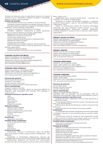 118 / JUDE%u021aUL BIHOR WWW.GHIDULPRIMARIILOR.ROfirmelor din comun%u01ce, acces la calea ferat%u01ce, acces la DJ, resurse naturale ce pot fi exploatate, incubator de afaceri %u00een localitatea %u0162e%u0163chea, for%u0163%u01ce de munc%u01ce calificat%u01ce.Proiecte de investi%u0163ii:%u020ambun%u0103t%u0103%u021birea infrastructurii rutiere %u00een comuna %u021ae%u021bcheaCanalizare %u0219i sta%u021bie de epurare %u00een localita%u021bile %u021ae%u021bchea %u0219i TelechiuExtindere re%u0163ea de canalizare menajer%u01ce %u00een localit%u01ce%u0163ile Hotar %u015fi Subpiatr%u01ce , Comuna %u0162e%u0163chea, jude%u0163ul BihorCapel%u0103 %u00een localitatea Telechiu(Cimitirul Ortodox)Extindere, reabilitare, modernizare %u0219i dotare a%u0219ez%u0103m%u00e2nt cultural %u00een comuna %u021ae%u021bchea, sat %u021ae%u021bchea, jude%u021bul BihorDigitalizarea serviciilor oferite cet%u01ce%u0163enilorReabilitarea infrastructurii electriceIntroducerea re%u021belei de gazCentru medical %u0219i de permanen%u021b%u0103 %u00een localitatea HotarReabilitarea cl%u0103dirilor publice%u020anfiin%u021bare parc fotovoltaicReabilitare,%u0219an%u021buri, pode%u021be, trotuare %u00een Comuna %u021ae%u021bcheaSta%u021bii de re%u00eenc%u0103rcare pentru vehicule electronice %u00een comuna %u021ae%u021bchea, jude%u021bul BihorConstruire cre%u015f%u01ce %u015fi gradini%u0163%u01ceDotarea c%u0103minelor culturale din comuna %u021ae%u021bcheaCOMUNA UILEACU DE BEIU%u015eAdres%u0103: Principal%u0103, nr. 73; Cod po%u0219tal: 417610Telefon: 0259-324077; Fax: 0259-324074; Adresa de e-mail: primaria.uileacudebeius@cjbihor.roprimaria.uileacudebeius@gmail.comURL: https://www.uileacudebeius.ro/COMUNA VADU CRI%u015eULUIAdres%u0103: Principal%u0103, nr. 1; Cod po%u0219tal: 417615Telefon: 0259- 443136; Fax: 0259-443037; Adresa de e-mail: primaria.vaducrisului@cjbihor.roURL: http://www.primaria-vaducrisului.ro/Persoane din primarie:Primar: Dorel Florian CosmaViceprimar: Ioan Ha%u0219a%u0219Secretar General: Mihai Luca%u015eef birou financiar-contabil: Adriana Maria PopSate %u00een administra%u021bie:Topade Cri%u015f, Birtin, TomnaticSuprafa%u021ba:%u00a0 7470 ha; Intravilan:%u00a0 912,43 ha; Extravilan:%u00a0 6557,57 ha; Popula%u021bia:%u00a0 4505; Gospod%u0103rii:%u00a0 1517; Locuin%u021be:%u00a0 1314; Gr%u0103dini%u021be:%u00a0 4; %u0218coli:%u00a05; Licee:%u00a01; Activitati economice si specifice zonei:Ol%u0103ritCeramic%u0103Agricultur%u0103Mic%u0103 industrieAgroturismCre%u015fterea animalelor%u00a0Obiective turistice:Defileul Cri%u015fului RepedePe%u015fterea Vadu-Cri%u015fuluiBiserica ortodox%u0103 monument istoricPensiuni agroturisticeCascadaHotel %u201cLa Dracula%u201dEvenimente:T%u00e2rgul de la Vama S%u0103riiFacilit%u00e3%u0163i oferite investitorilor:Acces la calea ferat%u0103 2 sta%u0163iiAcces DN 1TerenuriTelefonieElectrificareProiecte de investi%u0163ii:Conservarea, protec%u021bia %u0219i promovarea naturii de ambele p%u0103r%u021bi ale frontierei rom%u00e2no-ungare acronim PRONATURE , Cod ROHU126Reabilitarea %u0219i eficientizarea dispensarului comunal din localitatea Vadu Cri%u0219ului, comuna Vadu Cri%u0219ului, judetul Bihor-PNRRModernizarea sistemului de iluminat prin eficientizarea infrastructurii de iluminat public %u00een comuna Vadu Cri%u0219ului, jude%u021bul Bihor,, etapa 1-AFMModernizare drum comunal DC176 Birtin %u2013 Tomnatic km 7+467.99 %u2013 km 11+961.47%u201e-Anghel SalignyReabilitare %u00een vederea eficientiz%u0103rii energetice a colegiului tehnic nr.1 Vadu Cri%u0219ului - corp c2 -, din localitatea Vadu Cri%u0219ului, jude%u021bul Bihor%u201e-AFMDotare cu echipamente mobile din domeniul tehnologiei informa%u021biei de tipul tabletelor %u0219colare precum %u0219i a altor echipamente/dispositive electronice necesare desf%u0103%u0219urarii activit%u0103%u021bii didactice %u00een mediul on-line, %u00een Comuna Vadu Cri%u0219ului, jude%u021bul BihorORA%u0218UL VALEA LUI MIHAIAdres%u0103: Calea Revolu%u0163iei, nr. 2; Cod po%u0219tal: 415700Telefon: 0259-355216; Fax: 0259-355933; Adresa de e-mail: primaria@valealuimihai.roprimaria.valealuimihai@cjbihor.roURL: www.valealuimihai.ro, www.ermihalyfalva.roORA%u0218UL VA%u015eC%u0102UAdres%u0103: Unirii, nr. 75; Cod po%u0219tal: 415800Telefon: 0259-336157; Fax: 0259-336157; Adresa de e-mail: primaria_vascau@yahoo.comURL: www.primaria-vascau.roCOMUNA V%u00c2RCIOROGAdres%u0103: Nr. 104; Cod po%u0219tal: 417620Telefon: 0359-407977; Fax: 0359-407977; Adresa de e-mail: primaria.virciorog@cjbihor.roprimariavarciorog@yahoo.comURL: https://comunavirciorog.ro/COMUNA VII%u015eOARAAdres%u0103: Nr. 219; Cod po%u0219tal: 417625Telefon: 0359-175220; Adresa de e-mail: contact@primariaviisoara-bh.ro URL: www.primariaviisoara-bh.roPersoane din primarie:Primar: B%u00e9ke VasileSecretar General: Ziscu EvaContabil: Melinda Jol%u0163aSate %u00een administra%u021bie:Vii%u015foara, Izvoarele, Reghea, P%u0103dureniSuprafa%u021ba:%u00a0 4307 ha; Intravilan:%u00a0 120 ha; Extravilan:%u00a0 4187 ha; Popula%u021bia:%u00a01346; Gospod%u0103rii:%u00a0458; Locuin%u021be:%u00a0548; Gr%u0103dini%u021be:%u00a01; %u0218coli:%u00a02; Activitati economice si specifice zonei:Ocupa%u0163ia de baz%u0103 a popula%u0163iei comunei este agricultura %u015fi cre%u015fterea animalelorPe cele aproape 2000 ha arabil se cultiv%u0103 %u00een principal porumb, gr%u00e2u, ov%u0103z, floarea-soareluiExist%u0103 cultura vi%u0163ei de vie hibrid%u0103 pe cca 30 ha %u015fi livezi de m%u0103r prun %u015fi nucDintre animale se cresc bovine, ovine, porci %u015fi p%u0103s%u0103riEvenimente:Cu ocazia diferitelor s%u0103rbatori religioase %u015fi etnice se organizeaz%u0103 manifest%u0103ri culturale la care particip%u0103 %u015fcoala %u015fi corurile cultelor principaleCa eveniment local de men%u0163ionat este organizarea anual%u0103 a zilelor comunei la sf%u00e2r%u015fitul lunii august, c%u00e2nd au loc sute de manifest%u0103ri %u015fi evenimente %u00eencheiate cu foc de artificiiFacilit%u00e3%u0163i ofer