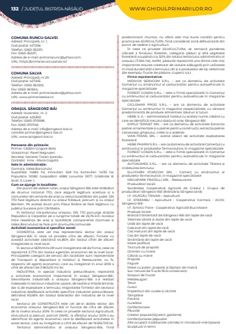 132 / JUDE%u021aUL BISTRI%u021aA-N%u0102S%u0102UD WWW.GHIDULPRIMARIILOR.ROCOMUNA RUNCU-SALVEIAdres%u0103: Principal%u0103, nr. 1; Cod po%u0219tal: 427256Telefon: 0263-352211; Fax: 0263-352211; Adresa de e-mail: primariarunc@yahoo.comURL: https://primariaruncusalvei.ro/COMUNA SALVAAdres%u0103: Principal%u0103, nr.29Cod po%u0219tal: 427255Telefon: 0263-361202; Fax: 0263-361654; Adresa de e-mail: primariasalva@yahoo.comURL: www.primariasalva.roORA%u0218UL S%u00c2NGEORZ-B%u0102IAdres%u0103: Izvoarelor, nr. 2Cod po%u0219tal: 425300Telefon: 0263-370598; Fax: 0263-370749; Adresa de e-mail: info@singeorz-bai.roconsilier.primar@singeorz-bai.roURL: www.sangeorz-bai.roPersoane din primarie:Primar: C%u0103t%u0103lin-Grigore BotaViceprimar: Pavel Negru%u0219eriSecretar General: Traian %u015eorec%u0103uContabil: %u00a0Irina - Maria Gogot%u0103Sate %u00een administra%u021bie:Cormaia, Valea BorcutuluiSuprafa%u021ba:%u00a0 14682 ha; Intravilan:%u00a0 549 ha; Extravilan:%u00a0 14133 ha; Popula%u021bia:%u00a0 12082; Gospod%u0103rii:%u00a0 4388; Locuin%u021be:%u00a0 3577; Gr%u0103dini%u021be:%u00a0 8; %u0218coli:%u00a03; Licee:%u00a01; Cum se ajunge in localitate:Din punct de vedere rutier, ora%u0219ul S%u00e2ngeorz-B%u0103i este str%u0103b%u0103tut de drumul na%u021bional 17D, care asigur%u0103 leg%u0103tura acestuia %u0219i a comunelor din amonte de ora%u0219 cu restul localit%u0103%u021bilor din jude%u021b. DN 17D face leg%u0103tura direct%u0103 cu ora%u0219ul N%u0103s%u0103ud, precum %u0219i cu ora%u0219ul Beclean. Pe acela%u0219i drum prin Pasul Rodna se face leg%u0103tura cu jude%u021bul Suceava prin C%u00e2rlibaba.%u00cen teritoriul intravilanului ora%u0219ului, DN 17D parcurge str%u0103zile Republicii %u0219i Carpa%u021bilor pe o lungime total%u0103 de 25,76 km. Accesul %u00eentre re%u0219edin%u021ba de ora%u0219 %u0219i localit%u0103%u021bile componente (Cormaia %u0219i Valea Borcutului) se face prin drumurile comunaleActivitati economice si specifice zonei:COMER%u021aUL este cel mai reprezentativ sector din ora%u0219ul S%u00e2ngeorz-B%u0103i %u00een ceea ce prive%u0219te cifra de afaceri, firmele cu aceast%u0103 activitate ob%u021bin%u00e2nd 44,80% din totalul cifrei de afaceri %u00eenregistrate la nivel local.%u00cen sectorul SERVICIILOR sunt %u00eenregistrate 48 de firme, ceea ce reprezint%u0103 3,77% din totalul agen%u021bilor economici de la nivel local. Principalele categorii de servicii din localitate sunt reprezentate de Transport %u0219i depozitare %u0219i Hoteluri %u0219i Restaurante, cu 15, respectiv 20 agen%u021bi economici, care au %u00eenregistrat %u00een anul 2018 o cifr%u0103 de afaceri de 3.963,03 mii lei.INDUSTRIA, %u00een special industria prelucr%u0103toare, reprezint%u0103 o activitate economic%u0103 important%u0103 %u00een ora%u0219ul S%u00e2ngeorz-B%u0103i. Dezvoltarea industrial%u0103 a ora%u0219ului S%u00e2ngeorz-B%u0103i s-a realizat %u00eendeosebi %u00een sectorul industriei u%u0219oare, de textile %u0219i %u00eembr%u0103c%u0103minte, dar %u0219i de exploatare a lemnului. Majoritatea firmelor din sectorul industrial desf%u0103%u0219oar%u0103 activit%u0103%u021bi specifice industriei prelucr%u0103toare, de%u021bin%u00e2nd 93,58% din totalul salaria%u021bilor din industria de la nivel local.Sectorul de CONSTRUC%u021aII este cel de-al doilea sector din economia ora%u0219ului S%u00e2ngeorz-B%u0103i %u00een func%u021bie de cifra de afaceri de la nivelul anului 2019. %u00cen ceea ce prive%u0219te sectorul Agricultur%u0103, silvicultur%u0103 %u0219i pescuit, potrivit ONRC, la sf%u00e2r%u0219itul anului 2019 s-au identificat 20 agen%u021bi economici care %u00ee%u0219i desf%u0103%u0219oar%u0103 activitatea %u00een acest sector, care au %u00eenregistrat o cifr%u0103 de afaceri de 19.535.703 lei.Teritoriul administrativ al ora%u0219ului S%u00e2ngeorz-B%u0103i, fiind predominant muntos, nu ofer%u0103 cele mai bune condi%u021bii pentru practicarea AGRICULTURII, fiind considerat zon%u0103 defavorizat%u0103 din punct de vedere a agriculturii.%u00cen ceea ce prive%u0219te SILVICULTURA, se remarc%u0103 ponderea ridicat%u0103 a fondului forestier, categoria p%u0103duri %u0219i alt%u0103 vegeta%u021bie forestier%u0103 ocup%u00e2nd cca. 50% din totalul teritoriului administrativ al ora%u0219ului (7.264 ha). Astfel, p%u0103durile reprezint%u0103 una dintre cele mai importante resurse creatoare de valoare ad%u0103ugat%u0103 prin utilizarea %u00een mod durabil at%u00e2t a lemnului c%u00e2t %u0219i a produselor de tip nelemnos (de exemplu: fructe de p%u0103dure, ciuperci %u0219.a.).Firme reprezentative:MIDIVOX SERVCOM S.R.L. %u2013 are ca domeniu de activitate Comer%u021bul cu am%u0103nuntul al carburan%u021bilor pentru autovehicule %u00een magazine specializateFOREST GOSEN S.R.L. %u2013 este o firm%u0103 specializat%u0103 %u00een Comer%u021bul cu am%u0103nuntul al carburan%u021bilor pentru autovehicule %u00een magazine specializateCICLOMAR PROD S.R.L. %u2013 are ca domeniu de activitate Comer%u021bul cu am%u0103nuntul %u00een magazine nespecializate, cu v%u00e2nzare predominant%u0103 de produse alimentare, b%u0103uturi %u0219i tutunHEBE S. A. %u2013 administreaz%u0103 hotelul cu acela%u0219i nume, cl%u0103dire cu care se identific%u0103 trecutul sta%u021biunii-ora%u0219 S%u00e2ngeorz-B%u0103iEXPLO TERASIT SRL %u2013 are ca domeniu de activitate Extrac%u021bia pietrei ornamentale %u0219i a pietrei pentru construc%u021bii, extrac%u021bia pietrei calcaroase, ghipsului, cretei %u0219i a ardezieiVIAN-TRANS SRL %u2013 av%u00e2nd obiect de activitate exploatarea forestier%u0103HEBE PHARM S.R.L. %u2013 are ca domeniu de activitate Comer%u021bul cu am%u0103nuntul al produselor farmaceutice, %u00een magazine specializateFOREST GOSEN S.R.L. %u2013 este o firm%u0103 specializat%u0103 %u00een Comer%u021bul cu am%u0103nuntul al carburan%u021bilor pentru autovehicule %u00een magazine specializateAUTOSOME%u0218 S.R.L. %u2013 are ca domeniu de activitate T%u0103ierea %u0219i rindeluirea lemnuluiELLYFARM STARCOM