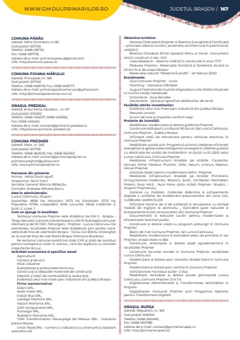 WWW.GHIDULPRIMARIILOR.RO JUDE%u021aUL BRA%u0218OV / 167COMUNA P%u0102R%u0102UAdres%u0103: Mihai Eminescu nr.85Cod po%u0219tal: 507155Telefon: 0268-287112; Fax: 0268-287178; Adresa de e-mail: primaria.parau@gmail.comURL: http://comuna-parau.roCOMUNA POIANA M%u0102RULUIAdres%u0103: Principal%u0103, nr. 189Cod po%u0219tal: 507160Telefon: 0368-008176; Fax: 0368-008177; Adresa de e-mail: primariapoianamarului@yahoo.comURL: http://primariapoianamarului.ro/ORA%u0218UL PREDEALAdres%u0103: B-dul Mihai S%u0103ulescu , nr 127Cod po%u0219tal: 505300Telefon: 0268-456237, 0268-455256; Fax: 0268-455425; Adresa de e-mail: contact@primaria-predeal.roURL: http://www.primaria-predeal.ro/COMUNA PREJMERAdres%u0103: Mare, nr. 565Cod po%u0219tal: 507165Telefon: 0268-362003; Fax: 0268-362363; Adresa de e-mail: contact@primariaprejmer.roprimaria.prejmer@yahoo.comURL: www.primariaprejmer.roPersoane din primarie:Primar: %u00a0Mihai Florin ApafiViceprimar: Sorin Tomi%u00a0Secretar General:%u00a0Bianca B%u0103l%u0103%u015fc%u0103u%u00a0Contabil: Andreea Mihaela BaciuSate %u00een administra%u021bie:Lunca Colnicului, StupiniSuprafa%u021ba:%u00a0 6826 ha; Intravilan:%u00a0 1073 ha; Extravilan:%u00a0 5733 ha; Popula%u021bia:%u00a0 10765; Gospod%u0103rii:%u00a0 5218; Locuin%u021be:%u00a0 2948; Gr%u0103dini%u021be:%u00a0 2; %u0218coli:%u00a02; Licee:%u00a01; Cum se ajunge in localitate:Teritoriul comunei Prejmer este str%u0103b%u0103tut de DN 11 - Bra%u015fov - T%u00e2rgu Secuiesc (care se intersecteaz%u0103 cu DN 10 la dreapta comunei H%u0103rman) %u015fi de DJ 112D -T%u0103rlungeni - Prejmer - Lunca C%u00e2lnicului. De asemenea, localitatea Prejmer este str%u0103b%u0103tut%u0103 prin partea nordvestic%u0103 de linia de cale ferat%u0103 Bra%u015fov - Ciceu (via Sf%u00e2ntu Gheorghe) iar la sud de linia de cale ferat%u0103 Bra%u015fov-%u00centorsura Buz%u0103ului. Pe teritoriul comunei exist%u0103 trei sta%u0163ii CFR %u015fi sta%u0163ii de autobuz pentru transportul rutier %u00een comun, care fac leg%u0103tura cu centrele importante din jur.Activitati economice si specifice zonei:Agricultur%u0103Comer%u0163 %u015fi serviciiMic%u0103 industrieExploatarea %u015fi prelucrarea lemnuluiConstruc%u0163ii %u015fi depozite materiale de construc%u0163iiDepozit %u015fi sta%u0163ii de combustibili %u015fi carburan%u0163iExisten%u0163a celui mai mare parc industrial din jude%u0163ul Bra%u015fovFirme reprezentative:Eldon SRL,Seda Invest SRL,Indcar Bus SRL,Loedige Machine SRL,Viacon Romania SRL,GJM Components SRL,Rumagol SRL,Rubitech Romania SRL,TDM Transformation Decoupage de Metaux SRL - industrie prelucr%u0103toare, Unior Tepid SRL %u2013 comer%u021b cu ridicata %u0219i cu amanuntul, reparare autovehiculeObiective turistice:Cetatea %u021a%u0103r%u0103neasc%u0103 Prejmer %u0219i Biserica Evanghelic%u0103 Fortificat%u0103 %u2013 princialul obiectiv turistic, ansamblu architectural %u00een patrimonial UNESCOBiserica Ortodox%u0103 Sfin%u021bii Apostoli Petru %u0219i Pavel- monument istoric construit in sec. XVIICasa S%u0103seasc%u0103 %u2013 obiectiv UNESCO, construit%u0103 %u00een anul 1777P%u0103durea Prejmer- Rezerva%u021bie floristic%u0103 %u0219i forestier%u0103 situat%u0103%u00a0 la 20 km N-E de ora%u0219ul Bra%u0219ov Rezerva%u021bia natural %u201cMla%u0219tina Eutrof%u0103%u201d %u2013 sit Natura 2000Evenimente:Ziua Comunei Prejmer - Iunie Fasching - Caravana Cl%u0103titelorAugust Festivalul de muzic%u0103 religioas%u0103 %u015fi culta Diletto Musicale %u00een incinta Cet%u0103%u0163ii MedievaleOctombrie - Ziua Recoltei Decembrie - obiceiuri specifice s%u0103rb%u0103torilor de iarn%u0103Facilit%u00e3%u0163i oferite investitorilor:Existen%u0163a celui mai mare parc industrial din jude%u0163ul Bra%u015fovResurse umane Scutiri de taxe %u0219i impozite conform legiiProiecte de investi%u0163ii:Reabilitare, modernizare %u0219i dotare gr%u0103dini%u021ba PrejmerConstruire sal%u0103 sport cu tribun%u0103 180 locuri, Sat Lunca Calnicului, Comuna Prejmer , Jude%u021bul Bra%u0219ov%u00cenfiin%u021bare sta%u021bii de re%u00eenc%u0103rcare pentru vehicule electrice, %u00een Comuna PrejmerReabilitare %u0219coal%u0103 prin Programul privind cre%u0219terea eficien%u021bei energetice %u0219i gestionarea inteligent%u0103 a energiei %u00een cl%u0103dirile publice cu destina%u021bie de unit%u0103%u021bi de %u00eenv%u0103%u021b%u0103m%u00e2nt- str.%u0218colii nr.22 (220) satul Lunca Calnicului, Comuna PrejmerRealizarea infrastructurii stradale pe str%u0103zile: Carpa%u021bilor, Cenu%u0219ii, Mihai Viteazul, Prunilor, Viilor, Saturn, Uranus, Neptun, Venus-PrejmerAchizi%u021bie dot%u0103ri pentru modernizare SVSU- PrejmerRealizarea infrastructurii stradale pe str%u0103zile: Prim%u0103verii, Dr.ing.Dionisie Hod%u00e2rn%u0103u, Bisericii, %u0218colii, Col.Stelian Rechi%u021bean, Poienii, Rura Mic%u0103 , Rura Mare, pista cicli%u0219ti Prejmer- Stupini, - Stupinii PrejmeruluiDotarea cu mobilier, materiale didactice %u0219i echipamente digitale a unit%u0103%u021bilor de %u00eenv%u0103%u021b%u0103m%u00e2nt preuniversitar din zona GAL CURBURA CARPA%u021aILOR%u00cenfiin%u021bare Centrul de zi de asisten%u021b%u0103 %u0219i recuperare, cu echip%u0103 mobil%u0103 de %u00eengrijire la domiciliu ,, Extindere gaze naturale %u0219i bran%u0219amente la to%u021bi consumatorii din Comuna PrejmerDocumenta%u021bii %u0219i execu%u021bie lucr%u0103ri pentru modernizare %u0219i eficientizare iluminat publicConstruire %u0219i dotare cre%u0219%u0103 cu program prelungit %u00een Comuna PrejmerBazin de %u00eenot Comuna Prejmer, sat Lunca Calnicului Reabilitare, modernizare %u0219i extindere sediu de prim%u0103rie %u00een sat Prejmer, strada Mare nr.565Construire, amenajare %u0219i dotare pia%u021b%u0103 agroalimentar%u0103 %u00een localitatea PrejmerConstruire locuin%u021be sociale %u00een Comuna Prejmer, localitatea Lunca CalniculuiModernizare %u0219i dotare parc recreativ Strada Mare %u00een Comuna PrejmerModernizare %u0219i dotare parc central %u00een Comuna PrejmerAchizi%