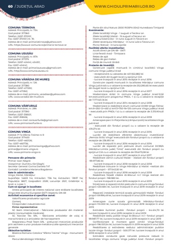 60 / JUDE%u021aUL ARAD WWW.GHIDULPRIMARIILOR.ROCOMUNA T%u00c2RNOVAAdres%u0103: Principal%u0103, nr. 734Cod po%u0219tal: 317360Telefon: 0257-370101; Fax: 0257-370101 int. 19; Adresa de e-mail: primariatirnova@yahoo.comURL: https://www.e-comune.ro/primaria-tarnova-arCOMUNA USUS%u0102UAdres%u0103: Principal%u0103, nr. 87ACod po%u0219tal: 317375Telefon: 0257-434141, 434101; Fax: 0257-434141; Adresa de e-mail: primariaususau@gmail.comURL: http://www.comunaususau.roCOMUNA V%u0102R%u0102DIA DE MURE%u015eAdres%u0103: Principal%u0103, nr. 126Cod po%u0219tal: 317380Telefon: 0257-417230; Fax: 0257-417250; Adresa de e-mail: primaria_varadiaar@yahoo.comURL: www.varadia-de-mures.roCOMUNA V%u00c2RFURILEAdres%u0103: Prim%u0103riei, nr. 286Cod po%u0219tal: 317390Telefon: 0257-318501; Fax: 0257-318506; Adresa de e-mail: consvarfurile@gmail.comURL: www.primariavirfurile.roCOMUNA VINGAAdres%u0103: P-Ta Sf%u00e2nta Treime nr.9Cod po%u0219tal: 317400Telefon: 0257-460126; Fax: 0257-460736; Adresa de e-mail: primariavinga@yahoo.comprimar@primaria-vinga.roURL: www.primaria-vinga.roPersoane din primarie:Primar: Ioan NegreiViceprimar: Dumitru Ilie SilaghiSecretar General: Corina Daniela TrifContabil: Loredana Mariana BogdanovSate %u00een administra%u021bie:Vinga, Mailat, M%u0103n%u0103%u015fturSuprafa%u021ba:%u00a0 14633 ha; Intravilan:%u00a0 736 ha; Extravilan:%u00a0 13937 ha; Popula%u021bia:%u00a0 5827; Gospod%u0103rii:%u00a0 2329; Locuin%u021be:%u00a0 2321; Gr%u0103dini%u021be:%u00a0 4; %u0218coli:%u00a04; Licee:%u00a01; Cum se ajunge in localitate:Artera principal%u0103%u00a0de interes na%u021bional care str%u0103bate localitatea Vinga este drumul European E671 respectiv DN 69Activitati economice si specifice zonei:Valorificarea produselor agricole Comer%u0163%u00centreprinderi industriale miciFirme reprezentative:SC Ikem Interna%u021bional %u2013 fabricarea produselor din material plastic (consumabile medicale)SC Narcise Tex SRL - fabricarea articolelor de voiaj si marochin%u0103rie %u0219i a articolelor de harna%u0219ament Stepanescu Prod Team SRL - prelucrari mecanice; produc%u021bie prin aschiere a unor produse metalice %u0219i alte opera%u021biuni mecanice generaleObiective turistice:Biserica Romano-Catolica %u201cSf%u00e2nta Treime%u201d Vinga - monument istoricParcul dendrologic M%u0103n%u0103%u015ftur Parte din situl Natura 2000 ROSPA 0042 Hunedoara Timi%u015fan%u0103Evenimente:Zilele localit%u0103%u0163ii Vinga - 1 august a fiec%u0103rui anZilele localit%u0103%u0163ii Mailat - 15 august a fiecarui anHramul bisericiilor - %u00een luna august %u00een fiecare anZilelel seceri%u015fului M%u0103n%u0103%u015ftur - %u00een luna iulie a fiecarui an Picnic festival - %u00een luna aprilieFacilit%u00e3%u0163i oferite investitorilor:Acces direct pe DN 69 - E671Linie ferat%u0103 Arad - Timi%u0219oaraRe%u021bea de ap%u0103Re%u021bea de gaz metanFor%u021b%u0103 de munc%u0103 t%u00e2n%u0103r%u0103Proiecte de investi%u0163ii:Construire capel%u0103 mortuar%u0103 %u00een cimitirul localit%u0103%u021bii Vinga comuna Vinga jude%u021bul Arad- recep%u021bionat%u0103 cu valoarea de 401.922,882 lei-%u00a0executat%u0103 din buget local cu sprijinul CJA- lucrare %u00eenceput%u0103 %u00een anul 2015 recep%u021bie %u00een anul 2016Construire capel%u0103 mortuar%u0103 %u00een localitatea M%u0103n%u0103%u015ftur comuna Vinga jud.Arad cu o valoare la recep%u021bie de 252.280,65 lei executat%u0103 din buget local cu sprijinul CJA-%u00a0lucrare %u00eenceput%u0103 %u00een anul 2016 recep%u021bie %u00een anul 2017Modernizare str%u0103zi %u00een comuna Vinga jude%u021bul Arad-12,52 km.executat%u0103 prin programul PNDL -1 %u0219i cu o valoare la recep%u021bie de 7.177.021,16 lei-%u00a0lucrare %u00eenceput%u0103 %u00een anul 2014 recep%u021bie %u00een anul 2018Modernizare %u0219i reabilitare drum comunal DC98 Vinga-Felnac km.9+250-12+450 %u0219i km13+750-16+125 comuna Vinga jude%u021bul Arad %u2013 executat%u0103 prin PNDL-1 %u0219i cu o valoare la recep%u021bie de 3.315.904,61 lei-%u00a0lucrare %u00eenceput%u0103 %u00een anul 2016 recep%u021bie %u00een anul 2018Amenajare parc %u00een Pia%u0163a Maria (c%u00e2mpul %u0219colii) localitatea Vinga jud.Arad- executat%u0103 din fonduri proprii cu o valoare la recep%u021bie de 419.274 lei-%u00a0lucrare %u00eenceput%u0103 %u00een anul 2016 recep%u021bie %u00een anul 2016Lucr%u0103ri de reabilitare aferente obiectivului investi%u021bional %u201eRemiza SVSU Vinga%u201d executat%u0103 din fonduri proprii cu o valoare la recep%u021bie de 236.810 lei-%u00a0lucrare %u00eenceput%u0103 %u00een anul 2016 recep%u021bie %u00een anul 2016Lucr%u0103ri de repara%u021bii prin pietruire drum comunal DC99/A M%u0103n%u0103%u0219tur-Limita jude%u021b Timi%u0219%u201d executat%u0103 din fonduri proprii cu sprijinul CJA cu o valoare la recep%u021bie de 315.673,08 lei-%u00a0lucrare %u00eenceput%u0103 %u00een anul 2017 recep%u021bie %u00een anul 2017Reabilitare c%u0103min cultural Mailat %u2013 realizat din fonduri proprii -99.977,85 lei-%u00a0lucrare %u00eenceput%u0103 %u00een anul 2018 recep%u021bie %u00een anul 2018Reabilitare trotuare %u00een Vinga M%u0103n%u0103%u0219tur %u0219i Mailat %u2013realizat din fonduri proprii %u2013 517.543,50 lei.- lucrare %u00eenceput%u0103 %u00een anul 2018 recep%u021bie %u00een anul 2018Reabilitare fa%u021bad%u0103 cl%u0103dire str.Blocuri nr.1 Vinga realizat din fonduri proprii -198.980 lei.- lucrare %u00eenceput%u0103 %u00een anul 2019 recep%u021bie %u00een anul 2019%u00centre%u021binere %u0219i repara%u021bii str%u0103zi pietruite %u00een comuna Vinga fonduri proprii-430.684 lei, lucrare %u00eenceput%u0103 %u00een anul 2019 recep%u021bie %u00een anul 2019Repara%u021bii instala%u021bie termic%u0103 %u0219coala gimnazial%u0103 Mailat- fonduri proprii-59.996,49 lei, lucrare %u00eenceput%u0103 %u00een anul 2019 recep%u021bie %u00een anul 2019Amenajare curte %u0219coala gimnazial%u0103 M%u0103n%u0103%u0219tur-fonduri proprii-110.000 lei, lucrare %u00eenceput%u0103 %u00een anul 2019 r