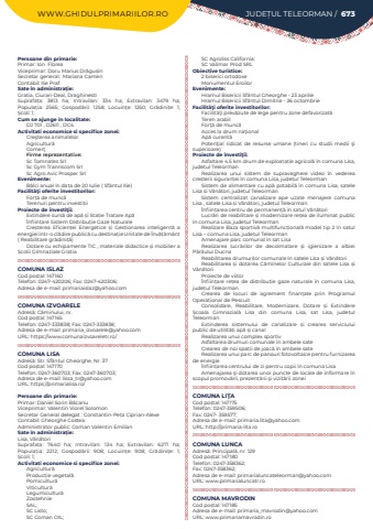 WWW.GHIDULPRIMARIILOR.RO JUDE%u021aUL TELEORMAN / 673Persoane din primarie:Primar: Ion%u00a0%u00a0Florea%u00a0Viceprimar: Doru Marius%u00a0Dr%u0103gu%u0219in%u00a0Secretar general:%u00a0 Mariana%u00a0CamenContabil: Ilie%u00a0Praf%u00a0Sate %u00een administra%u021bie:Gratia, Ciurari-Deal, DraghinestiSuprafa%u021ba:%u00a0 3813 ha; Intravilan:%u00a0 334 ha; Extravilan:%u00a0 3479 ha; Popula%u021bia:%u00a0 2565; Gospod%u0103rii:%u00a0 1258; Locuin%u021be:%u00a0 1250; Gr%u0103dini%u021be:%u00a0 1; %u0218coli:%u00a01; Cum se ajunge in localitate:DJ 701 , DJ611 , DC4Activitati economice si specifice zonei:Cre%u015fterea animalelorAgricultur%u0103Comer%u0163Firme reprezentative:Sc Tomnates SrlSc Gym Trannscom Srl Sc Agro Avic Prosper SrlEvenimente:B%u00e2lci anual %u00een data de 20 Iulie ( Sf%u00e2ntul Ilie)Facilit%u00e3%u0163i oferite investitorilor:For%u021b%u0103%u00a0de munc%u0103Terenuri pentru investi%u021biiProiecte de investi%u0163ii:Extindere surs%u0103%u00a0de ap%u0103%u00a0%u0219i Sta%u021bie Tratare Ap%u0103%u00cenfiin%u021bare Sistem Distribu%u021bie Gaze NaturaleCre%u0219terea Eficien%u021bei Energetice %u0219i Gestionarea inteligent%u0103%u00a0 a energiei %u00eentr-o cl%u0103dire public%u0103%u00a0cu destina%u021bie Unitate de %u00cenv%u0103%u021b%u0103m%u00e2nt ( Reabilitare gr%u0103dini%u021b%u0103)Dotare cu echipamente TIC , materiale didactice %u0219i mobilier a %u0218colii Gimnaziale GratiaCOMUNA ISLAZCod po%u0219tal: 147160Telefon: 0247-420206; Fax: 0247-420306; Adresa de e-mail: primariaislaz@yahoo.comCOMUNA IZVOARELEAdres%u0103: C%u0103minului, nr. Cod po%u0219tal: 147165Telefon: 0247-333838; Fax: 0247-333838; Adresa de e-mail: primaria_izvoarele@yahoo.comURL: https://www.comunaizvoareletr.ro/COMUNA LISAAdres%u0103: Str. Sf%u00e2ntul Gheorghe, Nr. 37Cod po%u0219tal: 147170Telefon: 0247-360703; Fax: 0247-360703; Adresa de e-mail: lissa_tr@yahoo.comURL: https://primarialisa.ro/Persoane din primarie:Primar: Daniel Sorin B%u0103canuViceprimar: Valentin Viorel SolomonSecretar General delegat : Constantin-Pe%u021ba Ciprian-AlexeContabil: Gheorghe CosteaAdministrator public: Coman Valentin EmilianSate %u00een administra%u021bie:Lisa, V%u00e2n%u0103toriSuprafa%u021ba:%u00a0 7640 ha; Intravilan:%u00a0 134 ha; Extravilan:%u00a0 6271 ha; Popula%u021bia:%u00a0 2212; Gospod%u0103rii:%u00a0 908; Locuin%u021be:%u00a0 908; Gr%u0103dini%u021be:%u00a0 1; %u0218coli:%u00a01; Activitati economice si specifice zonei:Agricultur%u0103Produc%u021bie vegetal%u0103Pomicultur%u0103Viticultur%u0103Legumicultur%u0103ZootehnieSAL;SC Listo;SC Coman OIL;SC Agroliss California:SC Valimar Prod SRLObiective turistice:2 biserici ortodoxeMonumentul EroilorEvenimente:Hramul Bisericii Sf%u00e2ntul Gheorghe - 23 aprilieHramul Bisericii Sf%u00e2ntul Dimitrie - 26 octombrieFacilit%u00e3%u0163i oferite investitorilor:Facilit%u0103%u0163i prev%u0103zute de lege pentru zone defavorizat%u0103Teren arabilFor%u0163%u0103 de munc%u0103Acces la drum na%u0163ionalAp%u0103 curent%u0103Poten%u0163ial ridicat de resurse umane (tineri cu studii medii %u015fi superioare)Proiecte de investi%u0163ii:Asfaltare 4.5 km drum de exploata%u021bie agricol%u0103%u00a0%u00een comuna Lisa, jude%u021bul TeleormanRealizarea unui sistem de supraveghere video %u00een vederea cre%u0219terii siguran%u021bei %u00een comuna Lisa, jude%u021bul TeleormanSistem de alimentare cu ap%u0103%u00a0potabil%u0103%u00a0%u00een comuna Lisa, satele Lisa %u0219i V%u00e2n%u0103tori, jude%u021bul TeleormanSistem centralizat canalizare ape uzate menajere comuna Lisa , satele Lisa %u0219i V%u00e2n%u0103tori, jude%u021bul Teleorman%u00cenfiin%u021barea centru de permanen%u021b%u0103%u00a0%u00een satul V%u00e2n%u0103toriLucr%u0103ri de reabilitare %u0219i modernizare re%u021bea de iluminat public %u00een comuna Lisa, jude%u021bul TeleormanRealizare Baza sportiv%u0103%u00a0multifunc%u021bional%u0103%u00a0model tip 2 %u00een satul Lisa %u2013 comuna Lisa, jude%u021bul TeleormanAmenajare parc comunal %u00een sat LisaRealizarea%u00a0 lucr%u0103rilor de%u00a0 decolmatare %u0219i igienizare a albiei P%u00e2r%u00e2ului DucnaReabilitarea drumurilor comunale %u00een satele Lisa %u0219i V%u00e2n%u0103toriReabilitarea %u0219i dotarea C%u0103minelor Culturale din satele Lisa %u0219i V%u00e2n%u0103toriProiecte de viitor%u00cenfiin%u021bare re%u021bea de distribu%u021bie gaze naturale %u00een comuna Lisa, jude%u021bul TeleormanCrearea de locuri de agrement finan%u021bate prin Programul Opera%u021bional de PescuitConsolidare, Reabilitare, Modernizare, Dotare %u0219i Extindere %u0218coala Gimnazial%u0103%u00a0 Lisa din comuna Lisa, sat Lisa, jude%u021bul TeleormanExtinderea sistemului de canalizare %u0219i crearea serviciului public de utilit%u0103%u021bi ap%u0103%u00a0%u0219i canalRealizarea unui complex sportivAsfaltarea drumuri comunale %u00een ambele sateCrearea de noi spa%u021bii de joac%u0103%u00a0%u00een ambele sateRealizarea unui parc de panouri fotovoltaice pentru furnizarea de energie%u00cenfiin%u021barea centrului de zi pentru copii %u00een comuna Lisa Amenajarea %u015fi dotarea unor puncte de locale de informare %u00een scopul promov%u0103rii, prezent%u0103rii %u015fi vizit%u0103rii zoneiCOMUNA LI%u0162ACod po%u0219tal: 147175Telefon: 0247-359506; Fax: 0247- 359577; Adresa de e-mail: primaria.lita@yahoo.comURL: http://primaria-lita.roCOMUNA LUNCAAdres%u0103: Principal%u0103, nr. 129Cod po%u0219tal: 147180Telefon: 0247-358362; Fax: 0247-358362; Adresa de e-mail: primarialuncateleorman@yahoo.comURL: www.primarialuncatr.roCOMUNA MAVRODINCod po%u0219tal: 147185Adresa de e-mail: primaria_mavrodin@yahoo.comURL: www.primariamavrodin.ro