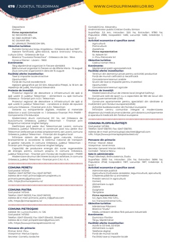 678 / JUDE%u021aUL TELEORMAN WWW.GHIDULPRIMARIILOR.RODepozitareComer%u021bFirme reprezentative:SC NICOCRIS SRLSC D&D AGRIVET SRLSC GILMAR SRLSC URANUS TRANSCOM SRL%u00a0Obiective turistice:Ruinele Conacului Iorgu Angelescu - Orbeasca de Sus 1907A%u0219ezare fortificat%u0103, geto-dacic%u0103, epoca bronzului timpuriu, cultura Glina - Orbeasca de SusBiserica %u201cCuvioasa Paraschiva%u201d - Orbeasca de Jos - 1844Conacul Rainer - L%u0103ceni - 1900Evenimente:T%u00e2rg s%u0103pt%u0103m%u00e2nal organizat %u00een fiecare s%u00e2mb%u0103t%u0103B%u00e2lciul anual organizat %u00een fiecare an%u00a0de Sf%u00e2nta Maria - 15 augustZiua comunei organizat%u0103 %u00een data de 15 augustFacilit%u00e3%u0163i oferite investitorilor:Taxe %u0219i impozite locale atractiveOportunit%u0103%u021bi:For%u0163%u0103 de munc%u0103 excedentar%u0103A%u015fezare geografic%u0103%u00a0pe DJ 504 Alexandria-Pite%u015fti, la 18 km de re%u015fedin%u0163a de jude%u0163, Municipiul%u00a0AlexandriaProiecte de investi%u0163ii:Proiectul regional de dezvoltare a infrastructurii de ap%u0103%u00a0 %u0219i ap%u0103%u00a0 uzat%u0103%u00a0 %u00een jude%u021bul Teleorman %u2013 alimentare cu ap%u0103%u00a0 Comuna Orbeasca - finan%u021bat prin A.D.I. TeleormanProiectul regional de dezvoltare a infrastructurii de ap%u0103%u00a0 %u0219i ap%u0103%u00a0uzat%u0103%u00a0%u00een jude%u021bul Teleorman - canalizare %u0219i sta%u021bie de epurare comuna Orbeasca %u2013 finan%u021bat prin A.D.I. TeleormanDotarea cu echipamente digitale, mobilier %u0219i materiale didactice a %u0219coli Gimnaziale nr. 1 Orbeasca-finan%u021bat Prin PNRR - Componenta C15-Educa%u021bieModernizare drum communal DC 54, sat Orbeasca de Sus,Comuna Orbeasca, jude%u021bul Teleorman %u2013 finan%u021bat prin Programul na%u021bional Anghel SalignyDesfiin%u021bare pod peste r%u00e2ul Teleorman,sat Laceni, comuna Orbeasca, jude%u021bul Teleorman %u0219i construire pod nou peste r%u00e2ul Teleorman (refacere pe acela%u0219i amplasament), sat Laceni, comuna Orbeasca, jude%u021bul Teleorman - Finan%u021bat din bugetul local%u00cenfiin%u021bare sistem de distribu%u021bie gaze naturale, inclusiv bran%u0219amente %u0219i racordarea la sistemul na%u021bional de transport al gazelor naturale, %u00een comuna Orbeasca, jude%u021bul Teleorman - finan%u021bat prin Programul na%u021bional Anghel SalignyCapacit%u0103%u021bi de producere energie din surse regenerabile de energie, pentru consum propriu %u00een comuna Orbeasca, jude%u021bul%u00a0Teleorman - finan%u021bat prin Fondul de modernizare %u2013 PNRRModernizare drumuri de interes local prin asfaltare, %u00een comuna Orbeasca, jude%u021bul Teleorman -finan%u021bat prin C.N.I.-S. A.COMUNA PERETUCod po%u0219tal: 147240Telefon: 0247-327167; Fax: 0247-327167; Adresa de e-mail: primaria@comunaperetu.roprimaria.peretu@yahoo.comURL: https://comunaperetu.ro/COMUNA PIATRACod po%u0219tal: 147245Telefon: 0247-361103; Fax: 0247-361103; Adresa de e-mail: primaria_piatra_tr@yahoo.comURL: https://primariapiatra.ro/COMUNA PIETRO%u015eANIAdres%u0103: Str. Lunca Dun%u0103rii, nr. 126Cod po%u0219tal: 147250Telefon: 0247-334402; Fax: 0247-334402, 334620; Adresa de e-mail: prinpietrosani@yahoo.comURL: https://www.primariapietrosanitr.ro/Persoane din primarie:Primar:%u00a0Emil%u00a0 PicuViceprimar: Marius Copoiu%u00a0Secretar: Corneliu Iordache%u00a0Contabil:Gina%u00a0 Alexandru%u00a0Andministrator public:Cristian Ovidiu Simion%u00a0Suprafa%u021ba:%u00a0 3,5 km; Intravilan:%u00a0 320 ha; Extravilan:%u00a0 9780 ha; Popula%u021bia:%u00a0 2985; Gospod%u0103rii:%u00a0 1485; Locuin%u021be:%u00a0 1485; Gr%u0103dini%u021be:%u00a0 1; %u0218coli:%u00a02; Activitati economice si specifice zonei:Agricultur%u0103Pomicultur%u0103ZootehnieFirme reprezentative:Sc Adavet Srl I.I. Picu Petronela SrlObiective turistice:Castrul roman RecaEvenimente:S%u0103pt%u0103m%u00e2nal pia%u021b%u0103 agrozootehnic%u0103Facilit%u00e3%u0163i oferite investitorilor:Terenuri din domeniul privat pentru activit%u0103%u021bi productiveFor%u021b%u0103 de munc%u0103 calificat%u0103 %u0219i necalificat%u0103Concesionare terenuri arabileScutiri de taxe %u0219i impozite pentru investitoriOportunit%u0103%u021bi:Concesionare terenuri agricoleProiecte de investi%u0163ii:Modernizare drumuri de interes local (Anghel Salihny)Construire sal%u0103 de sport cu o capacitate de 180 de locuri din fonduri guvernamentale (CNI)Construire apartamente pentru speciali%u0219tii din s%u0103n%u0103tate %u0219i %u00eenv%u0103%u021b%u0103m%u00e2nt prin fonduri europene(nZEB)Achizi%u021bie buldoexcavator din fornduri europene %u00cenfiin%u021bare centru comunitar integrat %u0219i modernizarea dispensarului medical uman %u0219i dentar, prin dotare cu echipamente %u0219i aparatur%u0103 medical%u0103 din fonduri europeneCOMUNA PLOPII-SL%u0102VITE%u015eTICod po%u0219tal: 147255Telefon: 0247-356701; Fax: 0247-356701; Adresa de e-mail: primaria.plopii.slavitesti@gmail.comURL: https://www.primariaplopiislavitesti.ro/Persoane din primarie:Primar:%u00a0 Marcel%u00a0%u00a0AlexeViceprimar: Ionel%u00a0Amza%u00a0Secretar General: Marian%u00a0Mitric%u0103Contabil:%u00a0 Tatiana%u00a0Neicu%u00a0Sate %u00een administra%u021bie:Plopii Sl%u0103vite%u015fti, Br%u00e2ncoveanca, DuduSuprafa%u021ba:%u00a0 5930 ha; Intravilan:%u00a0 234 ha; Extravilan:%u00a0 5696 ha; Popula%u021bia:%u00a0 2748; Gospod%u0103rii:%u00a0 1187; Locuin%u021be:%u00a0 1187; Gr%u0103dini%u021be:%u00a0 3; %u0218coli:%u00a01; Activitati economice si specifice zonei:Administra%u0163ie public%u0103Agricultura (Cultivarea cerealelor, legumicultur%u0103, apicultur%u0103)Cre%u015fterea p%u0103s%u0103rilor %u015fi animalelorPrest%u0103ri servicii %u00een agricultur%u0103Comer%u0163Alimentare cu ap%u0103Zid%u0103rieDulgherieT%u00e2mpl%u0103rieFirme reprezentative:S.C.Agro Alex Mar S.R.L. S.C.Transcontinental S.R.L.Obiective turistice:M%u00e2n%u0103stirea Pl%u0103viceniBiserica %u201cDudu%u201dMediu ambiant s%u0103n%u0103tos f%u0103r%u0103 poluare industrial%u0103Evenimente: