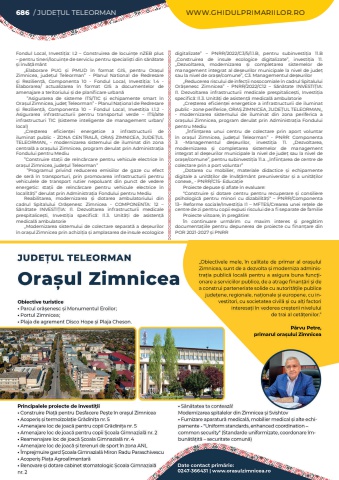 686 / JUDE%u021aUL TELEORMAN WWW.GHIDULPRIMARIILOR.ROFondul Local, Investi%u021bia: I.2 %u2013 Construirea de locuin%u021be nZEB plus %u2013 pentru tineri/locuin%u021be de serviciu pentru speciali%u0219ti din s%u0103n%u0103tate %u0219i %u00eenv%u0103%u021b%u0103m%u00e2nt%u201eElaborare PUG %u0219i PMUD %u00een format GIS, pentru Ora%u0219ul Zimnicea, jude%u021bul Teleorman%u201d - Planul National de Redresare %u0219i Rezilien%u021b%u0103, Componenta 10 - Fondul Local, Investi%u021bia: 1.4 - Elaborarea/ actualizarea %u00een format GIS a documentelor de amenajare a teritoriului %u0219i de planificare urban%u0103%u201dAsigurarea de sisteme ITS/TIC %u0219i echipamente smart %u00een Ora%u0219ul Zimnicea, jude%u021b Teleorman%u201d - Planul Na%u021bional de Redresare %u0219i Rezilien%u021b%u0103, Componenta 10 %u2013 Fondul Local, Investi%u021bia I.1.2 - Asigurarea infrastructurii pentru transportul verde %u2013 ITS/alte infrastructuri TIC (sisteme inteligente de management urban/local),,Cre%u0219terea eficien%u021bei energetice a infrastructurii de iluminat public - ZONA CENTRAL%u0102, ORA%u0218 ZIMNICEA, JUDE%u021aUL TELEORMAN,, - modernizarea sistemului de iluminat din zona central%u0103 a ora%u0219ului Zimnicea, program derulat prin Administra%u021bia Fondului pentru Mediu%u201dConstruire sta%u021bii de re%u00eenc%u0103rcare pentru vehicule electrice %u00een ora%u0219ul Zimnicea, jude%u021bul Teleorman%u201d%u201dProgramul privind reducerea emisiilor de gaze cu efect de ser%u0103 %u00een transporturi, prin promovarea infrastructurii pentru vehiculele de transport rutier nepoluant din punct de vedere energetic: sta%u021bii de re%u00eenc%u0103rcare pentru vehicule electrice %u00een localit%u0103%u021bi%u201d derulat prin Administra%u021bia Fondului pentru MediuReabilitarea, modernizarea %u0219i dotarea ambulatoriului din cadrul Spitalului Or%u0103%u0219enesc Zimnicea - COMPONENTA: 12 %u2013 S%u0103n%u0103tate INVESTI%u021aIA: I1. Dezvoltarea infrastructurii medicale prespitalice%u0219ti, Investi%u021bia specific%u0103: I1.3. Unit%u0103%u021bi de asisten%u021b%u0103 medical%u0103 ambulatorie,,Modernizarea sistemului de colectare separat%u0103 a de%u0219eurilor %u00een ora%u0219ul Zimnicea prin achizi%u021bia %u0219i amplasarea de insule ecologice digitalizate%u201d %u2013 PNRR/2022/C3/S/l.1.B, pentru subinvesti%u021bia 11.B ,,Construirea de insule ecologice digitalizate%u201d, investi%u021bia 11. ,,Dezvoltarea, modernizarea %u0219i completarea sistemelor de management integrat al de%u0219eurilor municipale la nivel de jude%u021b sau la nivel de ora%u0219e/comune%u201d, C3. Managementul de%u0219eurilor%u201eReducerea riscului de infec%u021bii nosocomiale %u00een cadrul Spitalului Or%u0103%u0219enesc Zimnicea%u201d - PNRR/2022/C12 %u2013 S%u0103n%u0103tate INVESTI%u021aIA: I1. Dezvoltarea infrastructurii medicale prespitalice%u0219ti, Investi%u021bia specific%u0103: I1.3. Unit%u0103%u021bi de asisten%u021b%u0103 medical%u0103 ambulatorie,,Cre%u0219terea eficien%u021bei energetice a infrastructurii de iluminat public - zone periferice, ORA%u0218 ZIMNICEA, JUDE%u021aUL TELEORMAN,, - modernizarea sistemului de iluminat din zona periferica a ora%u0219ului Zimnicea, program derulat prin Administra%u021bia Fondului pentru Mediu%u201e%u00cenfiin%u021barea unui centru de colectare prin aport voluntar %u00een ora%u0219ul Zimnicea, jude%u021bul Teleorman%u201d - PNRR: Componenta 3 -Managementul de%u0219eurilor, investi%u021bia 11. ,,Dezvoltarea, modernizarea %u0219i completarea sistemelor de management integrat al de%u0219eurilor municipale la nivel de jude%u021b sau la nivel de ora%u0219e/comune%u201d, pentru subinvesti%u021bia 11.a. ,,%u00eenfiin%u021barea de centre de colectare prin a port voluntar%u201d,,Dotarea cu mobilier, materiale didactice %u0219i echipamente digitale a unit%u0103%u021bilor de %u00eenv%u0103%u021b%u0103m%u00e2nt preuniversitar %u0219i a unit%u0103%u021bilor conexe,, - PNRR/C15- Educa%u021bieProiecte depuse %u0219i aflate %u00een evaluare:%u201cConstruire %u0219i dotare centru pentru recuperare %u0219i consiliere psihologic%u0103%u00a0 pentru minori cu dizabilit%u0103%u021bi%u201c %u2013 PNRR/Componenta 13%u2013 Reforme sociale/Investi%u021bia I1 %u2013 MFTES/Crearea unei re%u021bele de centre de zi pentru copii expusi riscului de a fi separate de familieProiecte viitoare, %u00een preg%u0103tire: %u00cen continuare urm%u0103rim cu maxim interes %u0219i preg%u0103tim documenta%u021biile pentru depunerea de proiecte cu finan%u021bare din POR 2021-2027 %u0219i PNRR