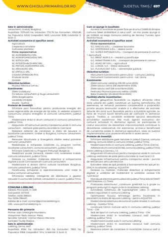 WWW.GHIDULPRIMARIILOR.RO JUDE%u021aUL TIMI%u0218 / 697Sate %u00een administra%u021bie:Lenauheim, Graba%u0163, Bulg%u0103ru%u015fSuprafa%u021ba:%u00a0 11274,60 ha; Intravilan:%u00a0 772,75 ha; Extravilan:%u00a0 10501,85 ha; Popula%u021bia:%u00a05200; Gospod%u0103rii:%u00a01633; Locuin%u021be:%u00a01939; Gr%u0103dini%u021be:%u00a03; %u0218coli:%u00a03; Activitati economice si specifice zonei:Agricultur%u0103Cre%u015fterea animalelorCultivarea plantelorFirme reprezentative:SC AGROBIBANU SRLSC AGROPOPAOVIDIU SRLSC SOTICA SRLSC INTERTEHNOFARM SRLSC PATCAS AGROIMPEX SRLSC ARHIAGRO SRLSC ERFOLG SRLCIOARA SPIRIDON PFAProduse locale:Cereale%u00a0Obiective turistice:Muzeul Nikolaus LenauEvenimente:Zilele Grab%u0103%u0163uluiFiii satului Lenauheim %u015fi Ruga LenauheimZilele Bulg%u0103ru%u015feneLocalit%u0103%u0163i %u00eenfr%u0103%u0163ite:Murek - Austria%u00a0Proiecte de investi%u0163ii:%u00cenfiin%u021bare parc fotovoltaic pentru producerea energiei din surse regenerabile de energie de tip solar, %u00een vederea acoperirii consumului propriu energetic al comunei Lenauheim, jude%u021bul Timi%u0219Modernizare str%u0103zi %u0219i drum comunal %u00een comuna Lenauheim, jude%u021bul Timi%u0219Asigurarea infrastructurii pentru transportul verde %u00een comuna Lenauheim - realizare piste pentru biciclete la nivel localRealizare sisteme de canalizare %u0219i sta%u021bii de epurare %u00een localitatile Lenauheim, Grabat %u0219i Bulg%u0103ru%u0219, comuna Lenauheim, jude%u021bul Timi%u0219Renovare Structurala %u0219i Energetic%u0103%u00a0 cl%u0103dire sediul prim%u0103riei comunei LenauheimReabilitarea %u0219i echiparea Gr%u0103dini%u021bei cu program normal, localitatea Lenauheim, comuna Lenauheim, jude%u021bul Timi%u0219%u00cenfiin%u021bare Gr%u0103dini%u021b%u0103%u00a0cu Program Prelungit Bulg%u0103ru%u0219Reabilitare %u0219coala General%u0103, clasele I-VIII, localitatea Grabat, comuna Lenauheim, jude%u021bul Timi%u0219Dotarea cu mobilier, materiale didactice %u0219i echipamente digitale a %u0219colii Gimnaziale din Comuna LenauheimModernizare %u0219i dotare c%u0103min cultural localitatea Bulg%u0103ru%u0219, comuna Lenauheim, jude%u021bul Timi%u0219Construirea, echiparea %u0219i operationalizarea unei cre%u0219e la nivelul comunei Lenauheim%u00cenfiin%u021barea re%u021belelor inteligente de distribu%u021bie a gazelor naturale %u00een comunele Gottlob, Lenauheim %u0219i Lovrin, jude%u021bul Timi%u0219COMUNA LIEBLINGAdres%u0103: Principal%u0103, nr. 528Cod po%u0219tal: 307245Telefon: 0256-396501; Fax: 0256-396421; Adresa de e-mail: contact@primarialiebling.roURL: www.primarialiebling.roPersoane din primarie:Primar: Ioan Gheorghe MunteanuViceprimar: Radu Marius%u00a0 PlesaSecretar General : Corina Vla%u0219cici MarianaContabil: Tiurbe RodicaSate %u00een administra%u021bie:Liebling, Cerna, IosifSuprafa%u021ba:%u00a0 8184 ha; Intravilan:%u00a0 352 ha; Extravilan:%u00a0 7832 ha; Popula%u021bia:%u00a03358; Gospod%u0103rii:%u00a01214; Gr%u0103dini%u021be:%u00a03; %u0218coli:%u00a03; Cum se ajunge in localitate:Accesul %u00een localitate se poate face pe drumul DJ693 B dinspre comuna Jebel str%u0103b%u0103t%u00e2nd %u0219i satul Iosif , se mai poate ajunge si pe DJ592A ce leaga Comuna Liebling de Sacosul Turcesc spre Mosni%u021ba Nou%u0103.Activitati economice si specifice zonei:Firme reprezentative:S.C. MAGUS S.R.L. %u2013 cre%u015fterea bovinelorS.C. OVIPRODEX S.R.L. %u2013 abator ovineS.C. SUPER IMPOSER S.R.L. %u2013 transport de persoane %u00een comun + agricultur%u0103S.C. BRIST AGRI S.A. %u2013 mor%u0103rit %u015fi panifica%u0163ieS.C. MIAM-TRANS S.R.L. %u2013 transport de persoane %u00een comunS.C. AGRO SP S.R.L. %u2013 agricultur%u0103S.C. LUKOIL S.A. %u2013 sta%u0163ie carburan%u0163i S.C. FLAVIUS OSF S.R.L. %u2013 alimenta%u021bie public%u0103.Obiective turistice:Monument Comemorativ pentru Eroi %u2013 comuna%u00a0Liebling Monument Comemorativ pentru Eroi %u2013 sat. CernaEvenimente:Zilele comunei Liebling (08-09 iunie 2025)Zilele satului Cerna (08 septembrie 2025)Zilele satului Iosif (08 octombrie 2025)Festivalul Pomana porcului edi%u021bia I (2025) Balul Duba%u0219ilor (25 decembrie 2025)Facilit%u00e3%u0163i oferite investitorilor:Pozi%u021bia geografic%u0103 favorabil%u0103, cu leg%u0103turi eficiente c%u0103tre zona urban%u0103 din jude%u021b, constituie un avantaj semnificativ. De asemenea, se remarc%u0103 ponderea considerabil%u0103 a propriet%u0103%u021bii private asupra terenurilor arabile %u0219i a efectivelor de animale. Solurile din zon%u0103 sunt favorabile pentru activit%u0103%u021bile agricole, iar for%u021ba de munc%u0103 local%u0103 beneficiaz%u0103 de calificare %u00een domeniul agricol. Tradi%u021bia %u0219i condi%u021biile existente sprijin%u0103 dezvoltarea activit%u0103%u021bilor zootehnice. Mai mult, agen%u021bii economici din comun%u0103 activeaz%u0103 %u00een domeniul agricol, iar participarea %u00een cadrul asocia%u021biilor de dezvoltare intercomunitar%u0103 contribuie la dezvoltarea colaborativ%u0103. De asemenea, primarul beneficiaz%u0103 de cuno%u0219tin%u021be solide %u00een domeniul agriculturii, ceea ce sus%u021bine implementarea unor proiecte eficiente %u00een acest sector.Proiecte de investi%u0163ii:%u00cenfiin%u021bare distribu%u021bie gaze naturale %u00een ora%u0219ul Ciacova, comuna Liebling, comuna Jebel %u0219i comuna Ghilad, jude%u021bul%u00a0Timi%u0219,Modernizare str%u0103zi %u00een comuna Liebling, jude%u021bul Timi%u0219 (Cerna),Asfaltare drum comunal DC166, comuna Liebling, jude%u021bul%u00a0Timi%u0219 (%u00eentre Liebling %u0219i Cerna) L.1.4Asigurarea infrastructurii pentru transportul verde %u00een comuna Liebling%u2013realizarea de piste pentru biciclete la nivel local l.1.3Asigurarea infrastructurii pentru transportul verde - puncte de re%u00eenc%u0103rcare vehicule electriceExtindere re%u021bea de ap%u0103 potabil%u0103 %u0219i bran%u0219amente de ap%u0103 pe str. DS9, %u00een localitatea Liebling -AQUATIMDotarea cu mobilier, materiale didactice %