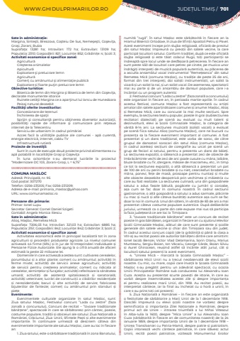 WWW.GHIDULPRIMARIILOR.RO JUDE%u021aUL TIMI%u0218 / 701Sate %u00een administra%u021bie:Margina, Sinte%u015fti, Breazova, Co%u015fteiu De Sus, Neme%u015fe%u015fti, Co%u015fevi%u0163a, Gro%u015fi, Zorani, BulzaSuprafa%u021ba:%u00a0 13281 ha; Intravilan:%u00a0 172 ha; Extravilan:%u00a0 13109 ha; Popula%u021bia:%u00a02310; Gospod%u0103rii:%u00a0821; Locuin%u021be:%u00a0852; Gr%u0103dini%u021be:%u00a04; %u0218coli:%u00a03; Activitati economice si specifice zonei:Agricultur%u0103Cre%u015fterea animalelorApicultur%u0103Exploatare %u015fi prelucrare lemnAgricultur%u0103Comer%u0163 cu am%u0103nuntul %u015fi alimenta%u0163ie public%u0103Exploatare %u015fi foarte pu%u0163in prelucrare lemn%u00a0Obiective turistice:Biserica de lemn din Margina %u015fi Biserica de lemn din Co%u015fevi%u0163a, declarate monumente istoriceRuinele cet%u0103%u0163ii Margina ce a apar%u0163inut lui Iancu de HunedoaraPeisaj natural deosebitFacilit%u00e3%u0163i oferite investitorilor:Concesionare de terenuri%u00cenchirierea de spa%u0163iiSprijin %u015fi consultan%u0163%u0103 pentru ob%u0163inerea diverselor autoriza%u0163ii, posibilit%u0103%u0163i rapide de informare %u015fi comunicare prin re%u0163eaua internet de la TelecentruServiciu de urbanism %u00een cadrul prim%u0103rieiAcces facil la utilit%u0103%u0163ile publice ale comunei - ap%u0103 curent%u0103, energie electric%u0103, internet, cablu TVInfrastructur%u0103 rutier%u0103Proiecte de investi%u0163ii:Sunt %u00een curs de execu%u015fie dou%u0103 proiecte privind alimentarea cu ap%u0103 potabil%u0103 %u00een localit%u0103%u0163ile Gro%u015fi %u015fi Co%u015fevi%u0163a%u00cen luna octombrie s-au demarat lucr%u0103rile la proiectul %u201cModernizare DC 103, Zorani-Gro%u015fi, L = 6,75%u201dCOMUNA MASLOCAdres%u0103: Principal%u0103, nr. 95Cod po%u0219tal: 307270Telefon: 0256-231205; Fax: 0256-231209; Adresa de e-mail: primaria_masloc@yahoo.comURL: www.comunamasloc.roPersoane din primarie:Primar: Ionel LupuSecretar General: Cornel Daniel SzigetiContabil: Angela Monica IliescuSate %u00een administra%u021bie:Alio%u015f, Ma%u015floc, Remetea Mic%u0103Suprafa%u021ba:%u00a0 7206,03 ha; Intravilan:%u00a0 321,03 ha; Extravilan:%u00a0 6885 ha; Popula%u021bia:%u00a02151; Gospod%u0103rii:%u00a0842; Locuin%u021be:%u00a0842; Gr%u0103dini%u021be:%u00a03; %u0218coli:%u00a02; Activitati economice si specifice zonei:Activitatea economic%u0103 este %u00een principal localizat%u0103 tot %u00een zona agriculturii %u0219i proces%u0103rii produselor agricole. La nivelul comunei activeaz%u0103 44 firme (SRL) %u0219i %u00een jur de 10 Inteprinderi Individuale %u0219i Persoane Fizice Autorizate. Ele ajung la o cifr%u0103 anual%u0103 de afaceri estimat%u0103 la peste 22 milioane lei. Domeniile %u00een care activeaz%u0103 acestea sunt: cultivarea cerealelor, porumbului %u0219i a altor plante; comer%u021b cu am%u0103nuntul; activit%u0103%u021bi %u00een ferme mixte; activit%u0103%u021bi de servicii anexe agriculturii; activit%u0103%u021bi de servicii pentru cre%u0219terea animalelor; comer%u021b cu ridicata al cerealelor, semin%u021belor %u0219i furajelor; activit%u0103%u021bi referitoare la s%u0103n%u0103tatea uman%u0103; activit%u0103%u021bi de asisten%u021b%u0103 spitaliceasc%u0103 %u0219i sanatorial%u0103; activit%u0103%u021bi veterinare; lucr%u0103ri de construc%u021bii a cl%u0103dirilor reziden%u021biale %u0219i nereziden%u021biale; baruri %u0219i alte activit%u0103%u021bi de servire; fabricarea bijuteriilor de fantezie; comer%u021b cu am%u0103nuntul prin standuri %u0219i pie%u021beEvenimente:Evenimentele culturale organizate %u00een satul Ma%u0219loc, sunt: Ziua satului Ma%u0219loc, Festivalul concurs %u201dLada cu zestre%u201d (faza zonal%u0103 a concursului), Concurs de recitat %u2013 %u201dIzvoare tradi%u021bionale b%u0103n%u0103%u021bene%u201d, spectacole %u00een care se s%u0103rb%u0103toresc prin c%u00e2ntec, poezie, costume populare, tradi%u021bii %u0219i obiceiuri ale satului: Ziua Na%u021bional%u0103 a Rom%u00e2niei, Cr%u0103ciunul, Ziua Unirii, Sfintele Pa%u0219ti %u0219i alte evenimente importante. %u00cen continuare urmeaz%u0103 s%u0103 descriem c%u00e2teva din evenimentele importante ale satului Ma%u0219loc, care au loc %u00een fiecare an:1. Ziua satului, este o s%u0103rb%u0103toare tradi%u021bional%u0103 %u00een zona Banatului, numit%u0103 %u201drug%u0103%u201d. %u00cen satul Ma%u0219loc este s%u0103rb%u0103torit%u0103 %u00een fiecare an la Hramul Bisericii Ortodoxe, %u00een ziua de Sfin%u021bii Apostoli Petru %u0219i Pavel. Acest eveniment %u00eencepe prin slujba religioas%u0103, oficiat%u0103 de preotul din satul Ma%u0219loc %u00eempreun%u0103 cu preo%u021bii din satele vecine, la care particip%u0103 locuitorii satului. Conform tradi%u021biei, dup%u0103 ce este oficiat%u0103 slujba religioas%u0103 %u0219i este t%u0103iat colacul Rugii, to%u021bi participan%u021bii se %u00eendreapt%u0103 spre locul unde se desf%u0103%u0219oar%u0103 petrecerea. %u00cen fiecare an sunt peste 450 de locuitori care petrec pe cinste, pe muzica unor %u00eendr%u0103gi%u021bi interpre%u021bi de muzic%u0103 popular%u0103 autentic%u0103, au pl%u0103cerea de a asculta ansamblul vocal instrumental %u201dReme%u021beanca%u201d din satul Remetea Mic%u0103 (comuna Ma%u0219loc), cu tradi%u021bie de peste 25 de ani, format din trei interpre%u021bi, doi soli%u0219ti instrumenti%u0219ti, un solist la vioar%u0103 %u0219i un solist la nai, %u0219i un solist vocal. De asemenea, spectatorii mai au parte %u0219i de un ansamblu de dansuri populare, care i-a %u00eenc%u00e2ntat cu un program autentic2. Festivalul concurs %u201dLada cu zestre%u201d (faza zonal%u0103 a concursului) este organizat %u00een fiecare an, %u00een perioada martie-aprilie. %u00cen cadrul acestui festival, comuna Ma%u0219loc a fost reprezentat%u0103 cu arti%u0219ti amatori din satele apar%u021bin%u0103toarei comunei %u0219i anume: Ma%u0219loc, Alio%u0219 %u0219i Remetea Mic%u0103, care au concurat la mai multe sec%u021biuni. Spre exemplu, la sec%u021bi