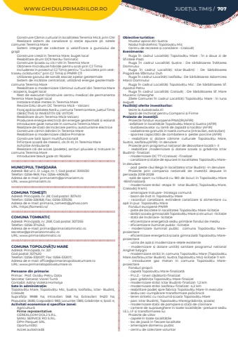 WWW.GHIDULPRIMARIILOR.RO JUDE%u021aUL TIMI%u0218 / 707Construire C%u0103min cultural %u00een localitatea%u00a0Teremia Mic%u0103, prin CNIRealizare sistem de canalizare %u0219i sta%u021bie epurare pt. satele comunei Teremia MareSistem integrat de colectare %u0219i valorificare a gunoiului de grajdConstruire cre%u0219%u0103 %u00een Teremia Mare, buget localReabilitare drum DC9 Ner%u0103u-TomnaticConstruire %u0218coala cu cls I-VIII %u00een Teremia MareOb%u021binere microbuze hibride pentru %u0219coli prin CJ Timi%u0219Includerea %u00een proiectul CJ Timi%u0219 pentru %u201dCu bicicleta prin vesttraseu cicloturistic%u201d prin CJ Timi%u0219 %u0219i PNRR C11Utilizarea gazului de sond%u0103 asociat apelor geotermaleSistem de %u00eenc%u0103lzire centralizat, utiliz%u00e2nd energie geotermal%u0103comuna Teremia MareReabilitare %u0219i modernizare C%u0103minul cultural din Teremia Mare - acoperi%u0219, buget localRest de executat-Construire centru medical de permanenta Teremia Mare buget localInstalare sta%u021bie meteo %u00een Teremia MareRevizie DALI drum DC Teremia Mic%u0103 %u2013 ValcaniForaj ap%u0103 localitatea Ner%u0103u, comuna%u00a0Teremia Mare, jue%u021bul%u00a0Timi%u0219OBIECTIVE %u0218I INVESTI%u021aII DE VIITOR:Reabilitare drum Teremia Mic%u0103-ValcaniProducere energie electric%u0103 din energie geotermal%u0103 %u0219i eolian%u0103Introducere gaze naturale %u00een comuna Teremia MareRealizare de sta%u021bii de %u00eenc%u0103rcare pentru autoturisme electriceConstruire c%u0103min b%u0103tr%u00e2ni %u00een Teremia MareReabilitare %u0219i modernizare cl%u0103dire Prim%u0103rieConstruire Sal%u0103 Sport multifunc%u021bional%u0103%u00cenfiin%u021bare %u0219coal%u0103 de meserii, cls IX-XI, %u00een Teremia MareAchizi%u021bie Ambulan%u021b%u0103 Realizare c%u0103i de acces (pode%u021be), %u0219an%u021buri pluviale %u0219i trotuare %u00een comuna Teremia Mare Introducere %u021beav%u0103 gaze str RozelorMUNICIPIUL TIMI%u015eOARAAdres%u0103: Bd-ul C. D. Loga, nr. 1; Cod po%u0219tal: 300030Telefon: 0256-969; Fax: 0256-490635; Adresa de e-mail: primariatm@primariatm.roURL: www.primariatm.roCOMUNA TOME%u015eTIAdres%u0103: Principal%u0103, nr. 28; Cod po%u0219tal: 307410Telefon: 0256-326168; Fax: 0256-331536; Adresa de e-mail: primaria_tomesti@yahoo.comURL: https://tomesti.ro/COMUNA TOMNATICAdres%u0103: Principal%u0103, nr. 258; Cod po%u0219tal: 307255Telefon: 0256-374243; Adresa de e-mail: primar@primariatomnatic.rosecretar@primariatomnatic.roURL: www.primariatomnatic.roCOMUNA TOPOLOV%u0102%u0162U MAREAdres%u0103: Principal%u0103, nr. 321Cod po%u0219tal: 307420Telefon: 0256-332037; Fax: 0256-332011; Adresa de e-mail: office@primariatopolovatumare.roURL: www.primariatopolovatumare.roPersoane din primarie:Primar:%u00a0 Prof. Ovidiu-Petru Do%u021baSecretar General: Viorel Turt%u0103Contabil: Adina Violeta HomolyaSate %u00een administra%u021bie:Topolov%u0103%u021bu Mare, Topolov%u0103%u021bu Mic, %u0218u%u0219tra, Iosifal%u0103u, Ictar- Budin%u021b, Cralov%u0103%u021bSuprafa%u021ba:%u00a0 9988 ha; Intravilan:%u00a0 568 ha; Extravilan:%u00a0 9420 ha; Popula%u021bia:%u00a02685; Gospod%u0103rii:%u00a0985; Locuin%u021be:%u00a01385; Gr%u0103dini%u021be:%u00a04; %u0218coli:%u00a04; Activitati economice si specifice zonei:Agricultur%u0103Firme reprezentative:CEREALCOM DOLJ S.R.L.SANU SERVICE RO S.R.L.DPH Parquet SRL Oportunit%u0103%u021bi:Acces autostrad%u0103Obiective turistice:Muzeul apicol din SustraNodul hidrotehnic Topolova%u021bu MicCentru de recreere %u0219i consiliere - Cralov%u0103%u021bEvenimente:Ruga %u00cen cadrul Localit%u0103%u021bi Topolov%u0103%u021bu Mare : %u00cen a doua zi de Sfintele Pa%u0219tiRuga %u00cen cadrul Localit%u0103%u021bi %u0218u%u0219tra : De s%u0103rb%u0103toarea %u00cen%u0103l%u021barea DomnuluiRuga %u00cen cadrul Localit%u0103%u021bi Ictar-Budin%u021bi : De S%u0103rb%u0103toarea Pogor%u0103rea Sf%u00e2ntului DuhRuga %u00cen cadrul Localit%u0103%u021bi Iosifal%u0103u : De S%u0103rb%u0103toarea Adormirea Maicii DomnuluiRuga %u00cen cadrul Localit%u0103%u021bi Topolov%u0103%u021bu Mic : De S%u0103rb%u0103toarea Sf. Apostol PetruRuga %u00cen cadrul Localit%u0103%u021bi Cralov%u0103%u021b : De S%u0103rb%u0103toarea Sf. Mare Mucenic Gheorghe Zilele Comunei %u00cen cadrul Localit%u0103%u021bi Topolov%u0103%u021bu Mare : %u00een luna augustFacilit%u00e3%u0163i oferite investitorilor:Iesire la Autostrada A1Spa%u021bii de %u00eenchiriat pentru Companii %u0219i FirmeProiecte de investi%u0163ii:Proiecte fonduri europene PNADR(AFIR):-asfaltare %u00een localit%u0103%u021bile Topolov%u0103%u021bu Mare %u0219i Sustra (AFIR) - buldoexcavator cu lam%u0103 de zapad%u0103 %u0219i toc%u0103tor (AFIR)- cadastrarea gratuit%u0103 %u00een toat%u0103 comuna (intravilan, extravilan) - sporirea capacit%u0103%u021bii de combatere a %u00a0pestei porcine (AFIR) - reabilitare %u0219i dotare c%u0103mine culturale Topolov%u0103%u021bu Mare, Sustra, Iosifalau(AFIR)- %u00een derulareProiecte prin programul na%u021bional de dezvoltare local%u0103 I- II- reabilitare ,modernizare %u0219i dotare %u0219coala %u0219i gr%u0103dini%u021ba Ictar Budin%u021bi- finalizat- modernizare DC 77 cCralova%u021b%u00a0%u2013finalizat- canalizare %u0219i sta%u021bie de epurare %u00een localitatea Topolov%u0103%u021bu Mare%u00een derulare- pod %u00a0peste r%u00e2ul Bega %u00een localitatea Ictar Budin%u021bi -%u00een derulareProiecte prin compania na%u021bional%u0103 de investi%u021bii depuse %u00een perioada 2018-2028-sal%u0103 de sport cu tribun%u0103 cu 180 de locuri %u00een Topolov%u0103%u021bu Mare -95%finalizat%u0103-%u00a0modernizare str%u0103zi -etapa III%u00a0 %u00a0Ictar Budin%u021bi, Topolov%u0103%u021bu Mare, Cralov%u0103%u021b( 9 km)-%u00a0amenajare trotuare- %u00eentreaga comun%u0103-%u00a0bazin de %u00eenot %u00een Topolov%u0103%u021bu Mare-%u00a0 racorduri canalizare, extindere canalizare %u0219i alimentare cu ap%u0103 %u00een puz%u00a0 Topolov%u0103%u021bu MareFonduri europene PNRR- piste de biciclete %u00een