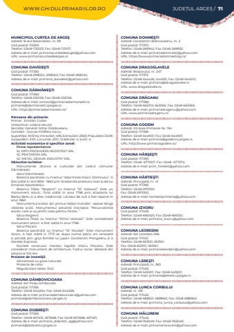WWW.GHIDULPRIMARIILOR.RO JUDE%u021aUL ARGE%u0218 / 71MUNICIPIUL CURTEA DE ARGE%u015eAdres%u0103: B-dul Basarabilor, nr. 99Cod po%u0219tal: 115300Telefon: 0248-721033; Fax: 0248-721107; Adresa de e-mail: primariacurteadearges@yahoo.comURL: www.primariacurteadearges.roCOMUNA DAVIDE%u015eTICod po%u0219tal: 117350Telefon: 0248-298024, 298060; Fax: 0248-298024; Adresa de e-mail: primaria_davidesti@yahoo.comCOMUNA D%u0102RM%u0102NE%u015eTICod po%u0219tal: 117360Telefon: 0248-232106; Fax: 0248-232106; Adresa de e-mail: contact@primariadarmanesti.roprimarie@darmanesti.cjarges.roURL: https://primariadarmanesti.ro/Persoane din primarie:Primar : Emilian CiolanViceprimar: Iuliana Veru%u021baSecretar General:%u00a0Mihai MoldoveanuContabil : Cocu%u021ba Filofteia GaciuSuprafa%u021ba:%u00a03415 ha; Intravilan:%u00a0495; Extravilan:%u00a02920; Popula%u021bia:%u00a03409; Gospod%u0103rii:%u00a02101; Locuin%u021be:%u00a02101; Gr%u0103dini%u021be:%u00a04; %u0218coli:%u00a04; Activitati economice si specifice zonei:Firme reprezentative:Sc MPO PRODIVERS REZISTENT SRLSC PENTAROM SRLSC METAL DESIGN INDUSTRY SRLObiective turistice:Monumente istorice %u0219i culturale din cadrul comunei D%u0103rm%u0103ne%u0219ti:Satul D%u0103rm%u0103ne%u0219ti:Biserica parohiala cu hramul %u201cAdormirea Maicii Domnului%u201d. A fost zidit%u0103 %u00een anii 1859 - 1863 prin stradaniile preotului Ioan %u0219i ale lui Emanoil ApostolescuBiserica filiala %u201cNegreni%u201d cu hramul %u201cSf. Voievozi%u201d. Este un monument istoric, fiind zidit%u0103 %u00een anul 1798 prin stradania lui Barbu Bellu %u0219i a altor credincio%u0219i. L%u0103ca%u0219ul de cult a fost reparat %u00een anul 1960Monumentul eroilor din primul r%u0103zboi mondial - a%u0219ezat l%u00e2ng%u0103 cl%u0103direa %u0219colii. Monumentul prezint%u0103 inscrip%u021bia: %u201cRecuno%u0219tin%u021b%u0103 eroilor care %u0219i-au jertfit via%u021ba pentru Patrie...%u201dSatul Negreni:Biserica filiala cu hramul %u201cSfintii Voievozi%u201d. Este considerat%u0103 monument istoric. A fost zidit%u0103 %u00een anul 1798.Satul Piscani:Biserica parohial%u0103 cu hramul %u201cSf. Nicolae%u201d. Este monument istoric. A fost zidit%u0103 %u00een 1773 iar dupa numai patru ani renovat%u0103 %u0219i pictat%u0103 prin grija familiei lui jupan Constantin Plangeanu %u0219i a stare%u021bei EvpraxiaRuinele conacului marelui logofat Vlaicu Piscanu. Este considerat monument de arhitectura. Fostul conac dateaz%u0103 din secolul al XVI-leaProiecte de investi%u0163ii:Alimentare cu gaze naturaleProiecte de viitorRegularizare Valea%u00a0 RiziiCOMUNA D%u00c2MBOVICIOARAAdres%u0103: Sat Podu D%u00eembovi%u021beiCod po%u0219tal: 117355Telefon: 0248-544204; Fax: 0248-544328; Adresa de e-mail: primariadambovicioara@yahoo.comprimarie@dambovicioara.cjarges.roCOMUNA DOBRE%u015eTICod po%u0219tal: 117365Telefon: 0248-657431, 657668; Fax: 0248-657668, 657431; Adresa de e-mail: primaria_dobresti_ag@yahoo.comprimarie@dobresti.cjarges.roCOMUNA DOMNE%u015eTIAdres%u0103: Constantin Br%u00e2ncoveanu, nr. 2Cod po%u0219tal: 117370Telefon: 0248-269942; Fax: 0248-269952; Adresa de e-mail: primariadomnesti@yahoo.comURL: https://www.primariadomnestiag.ro/COMUNA DRAGOSLAVELEAdres%u0103: Bra%u015fovului, nr. 247Cod po%u0219tal: 117375Telefon: 0248-544426, 544510; Fax: 0248-544510; Adresa de e-mail: primaria@dragoslavele.roURL: www.dragoslavele.roCOMUNA DR%u0102GANUCod po%u0219tal: 117380Telefon: 0248-663310, 663365; Fax: 0248-663365; Adresa de e-mail: primariadraganu@yahoo.comURL: www.primariadraganu.roCOMUNA GODENIAdres%u0103: Intrarea Primariei Nr. 194Cod po%u0219tal: 117385Telefon: 0248-544901; Fax: 0248-544901; Adresa de e-mail: primarie@godeni.cjarges.roURL: http://www.primariagodeni.ro/COMUNA H%u00c2R%u015eE%u015eTICod po%u0219tal: 117390Telefon: 0248- 677007; Fax: 0248- 677374; Adresa de e-mail: prim_hirsesti@yahoo.comCOMUNA H%u00c2RTIE%u015eTIAdres%u0103: Principal%u0103, nr. 41Cod po%u0219tal: 117395Telefon: 0248-297050; Fax: 0248-297050; Adresa de e-mail: hartiestiprimaria@yahoo.comCOMUNA IZVORUCod po%u0219tal: 117405Telefon: 0248-695020; Fax: 0248-695120; Adresa de e-mail: primaria_izvoru@yahoo.comCOMUNA LEORDENIAdres%u0103: Sat Leordeni 596Cod po%u0219tal: 117410Telefon: 0248-653101, 653161; Fax: 0248-653101, 653161; Adresa de e-mail: primarieleordeni@yahoo.comCOMUNA LERE%u015eTIAdres%u0103: Principal%u0103, nr. 383Cod po%u0219tal: 117430Telefon: 0248-549201; Fax: 0248-549201; Adresa de e-mail: primarie@leresti.cjarges.roCOMUNA LUNCA CORBULUIAdres%u0103: nr. 291Cod po%u0219tal: 117435Telefon: 0248-688501, 688960; Fax: 0248-688960; Adresa de e-mail: primaria_lunca_corbului@yahoo.comCOMUNA M%u0102LURENICod po%u0219tal: 117445Telefon: 0248-765049; Fax: 0248-765049; Adresa de e-mail: primariamalureni@yahoo.com