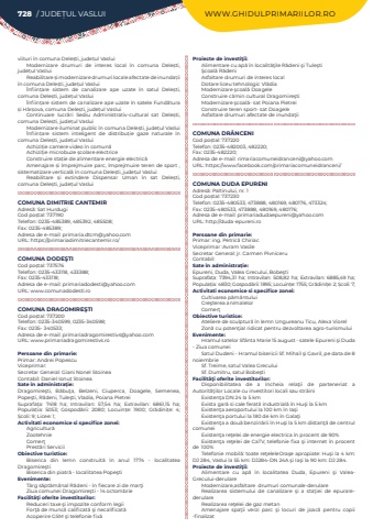 viituri %u00een comuna Dele%u0219ti, jude%u021bul VasluiModernizare drumuri de interes local %u00een comuna Dele%u0219ti, jude%u021bul VasluiReabilitare %u0219i modernizare drumuri locale afectate de inunda%u021bii %u00een comuna Dele%u0219ti, jude%u021bul Vaslui%u00cenfiin%u021bare sistem de canalizare ape uzate %u00een satul Dele%u0219ti, comuna Dele%u0219ti, jude%u021bul Vaslui%u00cenfiin%u021bare sistem de canalizare ape uzate %u00een satele Fund%u0103tura %u0219i H%u00e2r%u0219ova, comuna Dele%u0219ti, jude%u021bul VasluiContinuare lucr%u0103ri Sediu Administrativ-cultural sat Dele%u0219ti, comuna Dele%u0219ti, jude%u021bul VasluiModernizare iluminat public %u00een comuna Dele%u0219ti, jude%u021bul Vaslui%u00cenfiin%u021bare sistem inteligent de distribu%u021bie gaze naturale %u00een comuna Dele%u0219ti, jude%u021bul VasluiAchizi%u021bie camere video %u00een comun%u0103Achizi%u021bie microbuze %u0219colare electriceConstruire sta%u021bie de alimentare energie electric%u0103Amenajare %u0219i %u00eemprejmuire parc, %u00eemprejmuire teren de sport , sistematizare vertical%u0103%u00a0%u00een comuna Dele%u0219ti, jude%u021bul VasluiReabilitare %u0219i extindere Dispensar Uman %u00een sat Dele%u0219ti, comuna Dele%u0219ti, jude%u021bul VasluiCOMUNA DIMITRIE CANTEMIRAdres%u0103: Sat HurdugiCod po%u0219tal: 737190Telefon: 0235-485389, 485392, 485508; Fax: 0235-485389; Adresa de e-mail: primaria.dtcm@yahoo.comURL: https://primariadimitriecantemir.ro/COMUNA DODE%u015eTICod po%u0219tal: 737576Telefon: 0235-433118, 433388; Fax: 0235-433118; Adresa de e-mail: primariadodesti@yahoo.comURL: www.comunadodesti.roCOMUNA DRAGOMIRE%u015eTI Cod po%u0219tal: 737200Telefon: 0235-340599, 0235-340598; Fax: 0235- 340533; Adresa de e-mail: primariadragomirestivs@yahoo.comURL: www.primariadragomirestivs.roPersoane din primarie:Primar: Andrei PopescuViceprimar:%u00a0Secretar General:%u00a0Giani Nonel%u00a0StoineaContabil: Daniel Ionu%u021b StoineaSate %u00een administra%u021bie:Dragomire%u015fti, B%u0103bu%u0163a,%u00a0 Belzeni, Ciuperca, Doagele, Semenea, Pope%u015fti, R%u0103deni, Tule%u015fti, Vladia, Poiana PietreiSuprafa%u021ba:%u00a0 7418 ha; Intravilan:%u00a0 57,54 ha; Extravilan:%u00a0 6861,15 ha; Popula%u021bia:%u00a0 5053; Gospod%u0103rii:%u00a0 2080; Locuin%u021be:%u00a0 1900; Gr%u0103dini%u021be:%u00a0 4; %u0218coli:%u00a09; Licee:%u00a01; Activitati economice si specifice zonei:Agricultur%u0103ZootehnieComer%u0163Prest%u0103ri ServiciiObiective turistice:Biserica din lemn construit%u0103 %u00een anul 1774 - localitatea Dragomire%u015ftiBiserica din piatr%u0103 - localitatea Pope%u015ftiEvenimente:T%u00e2rg s%u0103pt%u0103m%u00e2nal R%u0103deni - %u00een fiecare zi de mar%u0163iZiua comunei Dragomire%u015fti - 14 octombrieFacilit%u00e3%u0163i oferite investitorilor:Reduceri taxe %u015fi impozite conform legiiFor%u0163%u0103 de munc%u0103 calificat%u0103 %u015fi necalificat%u0103Acoperire GSM %u015fi telefonie fix%u0103Proiecte de investi%u0163ii:Alimentare cu ap%u0103 %u00een localit%u0103%u0163ile R%u0103deni %u015fi Tule%u015fti%u015ecoal%u0103 R%u0103deniAsfaltare drumuri de interes localDotare liceu tehnologic Vl%u0103diaModernizare %u015fcoal%u0103 DoageleConstruire c%u0103min cultural Dragomire%u015ftiModernizare %u015fcoal%u0103- sat Poiana PietreiConstruire teren sport- sat DoageleAsfaltare drumuri afectate de inunda%u0163iiCOMUNA DR%u00c2NCENICod po%u0219tal: 737220Telefon: 0235-482003, 482220; Fax: 0235-482220; Adresa de e-mail: rimariacomuneidranceni@yahoo.comURL: https://www.facebook.com/primariacomuneidranceni/COMUNA DUDA EPURENI Adres%u0103: Paltinului, nr. 1Cod po%u0219tal: 737230Telefon: 0235-480533, 473888, 480169, 480176, 473324; Fax: 0235-480533, 473888, 480169, 480176; Adresa de e-mail: primariadudaepureni@yahoo.comURL: http://duda-epureni.roPersoane din primarie:Primar: ing. Petric%u0103 ChiriacViceprimar :Avram VasileSecretar General: jr. Carmen PivniceruContabil:%u00a0Sate %u00een administra%u021bie:Epureni, Duda, Valea Grecului, Bobe%u015ftiSuprafa%u021ba:%u00a0 7394,31 ha; Intravilan:%u00a0 508,82 ha; Extravilan:%u00a0 6885,49 ha; Popula%u021bia:%u00a04830; Gospod%u0103rii:%u00a01895; Locuin%u021be:%u00a01755; Gr%u0103dini%u021be:%u00a02; %u0218coli:%u00a07; Activitati economice si specifice zonei:Cultivarea p%u0103m%u00e2ntuluiCre%u015fterea animalelorComer%u0163Obiective turistice:Ateliere de sculptur%u0103 %u00een lemn Ungureanu Ticu, Alexa ViorelZon%u0103 cu poten%u0163ial ridicat pentru dezvoltarea agro-turismuluiEvenimente:Hramul satelor Sf%u00e2nta Marie 15 august - satele Epureni %u015fi Duda - Ziua comuneiSatul Dudeni - Hramul bisericii Sf. Mihail %u015fi Gavril, pe data de 8 noiembrieSf. Treime, satul Valea GreculuiSf. Dumitru, satul Bobe%u015fti%u00a0Facilit%u00e3%u0163i oferite investitorilor:Disponibilitatea de a %u00eencheia rela%u0163ii de parteneriat a Autorit%u0103%u0163ilor Locale cu investitori locali sau str%u0103iniExisten%u0163a DN 24 la 5 kmExista gar%u0103 si cale ferat%u0103 industrial%u0103 %u00een Hu%u015fi la 5 kmExisten%u0163a aeroportului la 100 km %u00een Ia%u015fiExisten%u0163a portului la 180 de km %u00een Gala%u0163iExisten%u0163a a dou%u0103 benzin%u0103rii %u00een Hu%u015fi la 5 km distan%u0163%u0103 de centrul comuneiExisten%u0163a re%u0163elei de energie electrica %u00een procent de 90%Existen%u0163a re%u0163elei de CaTV, telefonie fixa %u015fi internet %u00een procent de 100%Telefonie mobil%u0103: toate re%u0163eleleOra%u015fe apropiate: Hu%u015fi la 4 km: DJ 284, Vaslui la 55 km: DJ284-DN 24A %u015fi Ia%u015fi la 90 km: DJ 284.Proiecte de investi%u0163ii:Alimentare cu ap%u0103 %u00een localitatea Duda, Epureni %u015fi ValeaGrecului-derulareModernizare,asfaltare%u00a0 drumuri comunale-derulare%u00a0Realizarea sistemului de canalizare %u015fi a sta%u0163iei de epurarederulareRealizarea re%u0163elei de gaz metanAmenajare spa%u0163ii verzi parc %u015fi locuri de joac%u0103%u00a0 pentru copii -finalizat728 / JUDE%u021aUL VASLUI WWW.GHIDULPR