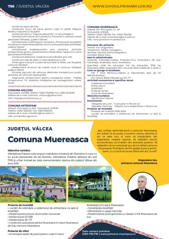 Construie bazin de %u00eenotConstruire locuri de joac%u0103 pentru copii %u00een satele M%u0103gura, Buleta, Vulpues%u0219i %u0219i Stup%u0103reiConstruire parcul %u201cLaguna pescarilor%u201d, %u00een satul NegreniAchizi%u021bionare tractor prin proiectul %u201cPunerea %u00een valoare a zonei pesc%u0103re%u0219ti Mihae%u0219ti, judetul V%u00e2lcea%u201dAchizi%u021bionare multihog prin proiectul %u201ePromovarea bun%u0103st%u0103rii sociale prin intretinerea spa%u021biilor verzi %u00een zona pesc%u00eereasc%u0103%u00a0Mih%u0103e%u0219ti, jude%u021bul Valcea%u201dAchizi%u021bionare buldoexcavator prin proiectul %u201eAchizi%u021bie echipamente pentru salubrizarea %u0219i %u00eentre%u021binerea mediului %u00een zona pesc%u0103reasc%u0103%u00a0Mih%u0103e%u0219ti%u201dConstruire dispensar medical %u00een satul Buleta prin CNIConstruire sal%u0103 de sport %u00een satul Buleta prin CNIAmenajare trotuare %u0219i piste de biciclete la DN64, sat Stup%u0103rei, comuna Mih%u0103e%u0219tiModernizare drumuri de interes local %u00een comuna Mih%u0103e%u0219ti, jude%u021bul V%u00e2lcea%u00cennoirea parcului de vehicule destinate transportului public (achizi%u021bia de vehicule nepoluante) Asigurarea infrastructurii pentru transportul verde %u2013 ITS/alte infrastructuri TIC (sisteme inteligente de management urban/local)COMUNA MILCOIUCod po%u0219tal: 247395; Telefon: 0250-760189; Fax: 0350-524693; Adresa de e-mail: primaria_milcoiu@yahoo.comURL: http://primariamilcoiu.roCOMUNA MITROFANIAdres%u0103: Principala nr.220; Cod po%u0219tal: 247676Telefon: 0350-525230; Fax: 0350-525230; Adresa de e-mail: mitrofani@vl.e-adm.roURL: prmitrofani.gprim.roCOMUNA MUEREASCAAdres%u0103: Str. Principal%u0103, nr,. 49Cod po%u0219tal: 247405Telefon: 0250-755730; Fax: 0250-755730; Adresa de e-mail: muereasca@vl.e-adm.roURL: www.primaria-muereasca.roPersoane din primarie:Primar: Ion UngureanuViceprimar: C%u0103t%u0103lin GeorgescuSecretar General: Elena Dr%u0103goescuContabil: Elena V%u00eelcuSate %u00een administra%u021bie:Hotarele, Fr%u00e2nce%u015fti-Coasta, Pripoara-Grui, Muereasca De Sus, G%u0103v%u0103ne%u015fti, Andreie%u015fti, %u0218uta, MuereascaSuprafa%u021ba:%u00a0 4106 ha; Intravilan:%u00a0 341 ha; Extravilan:%u00a0 3765 ha; Popula%u021bia:%u00a02690; Gospod%u0103rii:%u00a0821; Locuin%u021be:%u00a01004; Gr%u0103dini%u021be:%u00a03; %u0218coli:%u00a02; Cum se ajunge in localitate:DN 7 %u00eentre R%u00e2mnicu-V%u00e2lcea %u0219i C%u0103lim%u0103ne%u0219ti apoi pe DJ 658-Muereasca Din Ora%u0219ul B%u0103ile Ol%u0103ne%u0219ti pe DC 171Activitati economice si specifice zonei:Cre%u015fterea animalelorPomicultur%u0103Gr%u0103din%u0103ritProduse locale: %u021auic%u0103 de MuereascaObiective turistice:M%u0103n%u0103stirea Fr%u0103sineiEvenimente:%u201cAlegerea de june%u201d - 6 ianuarie %u00een fiecare an %u201cRoadele Toamnei%u201d - sf%u00e2r%u015fitul lunii septembrie a fiec%u0103rui anProiecte de investi%u0163ii:Proiecte de investi%u021bii 2016-2024Lucr%u0103ri de extindere a sistemului de alimentare cu ap%u0103 al localit%u0103%u0163ii756 / JUDE%u021aUL V%u00c2LCEA WWW.GHIDULPRIMARIILOR.RO