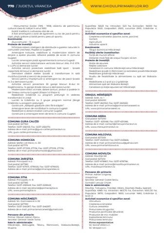 -%u00a0 Monumentul Eroilor (1916 - 1918), obiectiv de patrimoniu cultural clasa B, %u00een%u0103l%u0163at %u00een anul 1930Exist%u0103 tradi%u021bie %u00een cultivarea vi%u021bei de vie. A fost amenajat%u0103 o zon%u0103 de agrement cu loc de joac%u0103 pentru copii, plaj%u0103, gr%u0103tare %u0219i balt%u0103 pentru pescuit sportiv.Evenimente:Ziua comunei %u2013 15 august.Proiecte de investi%u0163ii:%u00cenfiin%u021bare sistem inteligent de distribu%u021bie a gazelor naturale %u00een comunele Ureche%u0219ti, Pope%u0219ti %u0219i Guge%u0219tiAmenajare trotuare, reabilitare %u0219i modernizare sistem de dirijare a apelor pluviale, refacere pode%u021be de acces %u00een comuna Guge%u0219tiLucr%u0103ri amenajare pia%u021b%u0103 agroalimentar%u0103 comuna Guge%u0219tiAchizi%u021bie servicii sistematizare verticala blocuri ANL P+3 STR. V. LUPU %u0219i demarare lucr%u0103riAchizi%u021bie servicii proiectare reabilitare Sal%u0103 sport - %u0218coal%u0103 capacitate 50 locuri %u0219i demarare lucr%u0103riDemolare cl%u0103dire Atelier %u0218coal%u0103 %u0219i transformare %u00een sal%u0103 multifunc%u021bional%u0103 %u0219i servicii de proiectareServicii pentru %u00eemprejmuire %u0219i amenajare loc de joac%u0103 %u0218coala nr.3 %u0219i demarare lucr%u0103riAchizi%u021bie servicii proiectare 30 garaje blocuri B-dul M. Kog%u0103lniceanu, 14 garaje strada Venus %u0219i demarare lucr%u0103riModernizare str%u0103zi vicinale, dalare %u0219an%u021buri, poduri %u0219i pode%u021be %u00een sat Oreavu comuna Guge%u0219ti (Etapa I %u0219i Etapa II)Reabilitare Gr%u0103dini%u021b%u0103 cu program prelungit %u00een vederea transform%u0103rii %u00een cre%u0219%u0103Lucr%u0103ri la Gr%u0103dini%u021ba cu 3 grupe program normal (l%u00e2ng%u0103 Gr%u0103dini%u021ba cu program prelungit)Construire %u201eAd%u0103post g%u0103zduire c%u00e2ini f%u0103r%u0103 st%u0103p%u00e2n%u201dAmenajare teren de minifotbal %u00een comuna Guge%u0219tiReabilitare %u0219i dotare stadion comunal Guge%u0219tiConstruire %u0219i amenajare teren de tenis %u00een comuna Guge%u0219tiCOMUNA GURA CALI%u0162EICod po%u0219tal: 627160Telefon: 0237-255103; Fax: 0237-255070; Adresa de e-mail: primar@gura-calitei.primarievn.roURL: gura-calitei.primarievn.roCOMUNA HOMOCEAAdres%u0103: %u015etefan cel Mare, nr. 30Cod po%u0219tal: 627175Telefon: 0237-271109, 271116; Fax: 0237-271109, 271116; Adresa de e-mail: primariahomocea@yahoo.comCOMUNA JARI%u015eTEAAdres%u0103: Principala nr.2Cod po%u0219tal: 627180Telefon: 0237-679111, 679005; Fax: 0237-679005; Adresa de e-mail: primaria@primariajaristea.roCOMUNA JITIAAdres%u0103: Principal%u0103, nr. 8Cod po%u0219tal: 627185Telefon: 0237-259949; Fax: 0237-259949; Adresa de e-mail: secretariat@primariajitia.roURL: www.primariajitia.roCOMUNA M%u0102IC%u0102NE%u015eTIAdres%u0103: Str. Domneasca nr.32Cod po%u0219tal: 627190Telefon: 0237-246297; Fax: 0237-246297; Adresa de e-mail: primariamaicanesti@ymail.comPersoane din primarie:Primar: R%u0103zvan Adrian PascuSecretar General: Vasile TomaSate %u00een administra%u021bie:M%u0103ic%u0103ne%u015fti, Belciugele, T%u0103taru, R%u00e2mniceni, Slobozia-Bote%u015fti, StupinaSuprafa%u021ba:%u00a0 16523 ha; Intravilan:%u00a0 523 ha; Extravilan:%u00a0 16000 ha; Popula%u021bia:%u00a0 5522; Gospod%u0103rii:%u00a0 2500; Locuin%u021be:%u00a0 2910; Gr%u0103dini%u021be:%u00a0 4; %u0218coli:%u00a06; Activitati economice si specifice zonei:Cre%u015fterea animalelor (bovine, ovine, porcine)Comer%u0163Agricultur%u0103Industrie u%u015foar%u0103Evenimente:T%u00e2rgul duminical M%u0103ic%u0103ne%u015ftiFacilit%u00e3%u0163i oferite investitorilor:For%u0163%u0103 de munc%u0103 ieftin%u0103Distan%u0163%u0103 mic%u0103 fa%u0163%u0103 de ora%u015ful Foc%u015fani 45 kmProiecte de investi%u0163ii:Sta%u0163ie de epurareRe%u0163ele colectareCanalizare %u00een comuna M%u0103ic%u0103ne%u015fti satul M%u0103ic%u0103ne%u015ftiReabilitare %u015fcoal%u0103 %u00een R%u00e2mniceni %u015fi extindere %u015fcoal%u0103 M%u0103ic%u0103ne%u015ftiReabilitare gr%u0103dini%u0163%u0103 M%u0103ic%u0103ne%u015ftiStudiu de fezabilitate la alimentarea cu ap%u0103 sat SloboziaBote%u015ftiReabilitarea a 2 %u015fcoli %u015fi a 2 gr%u0103dini%u0163eAlimentare ap%u0103 sat Slobozia-Bote%u015ftiCanalizare %u015fi sta%u0163ie epurare sat M%u0103ic%u0103ne%u015ftiORA%u0218UL M%u0102R%u0102%u015eE%u015eTIAdres%u0103: Siret, nr. 1Cod po%u0219tal: 625200Telefon: 0237-260150; Fax: 0237-260550; Adresa de e-mail: primaria@primariamarasesti.roURL: www.primariamarasesti.roCOMUNA MERACod po%u0219tal: 627200Telefon: 0237- 631066; Fax: 0237-631066; Adresa de e-mail: contact@mera.primarievn.roURL: www.mera.primarievn.roCOMUNA MILCOVULCod po%u0219tal: 627205Telefon: 0237-243040; Fax: 0237-243666; Adresa de e-mail: primariamilcovul@yahoo.comURL: www.primariamilcovul.roCOMUNA MOVILI%u0162AAdres%u0103: Movili%u0163ei 68Cod po%u0219tal: 627210Telefon: 0237-678801; Fax: 0237-678756; Adresa de e-mail: primar@movilita.primarievn.roURL: movilita.primarievn.roPersoane din primarie:Primar: Adrian Grigora%u015fViceprimar:%u00a0Secretar General: Costel%u00a0SeciuContabil: Lenu%u0163a%u00a0Chicet%u00a0Sate %u00een administra%u021bie:Movili%u0163a, Trotu%u015fanu,%u00a0Frec%u0103%u0163ei, V%u0103leni, Dioche%u0163i-Rediu, Sperie%u021biSuprafa%u021ba:%u00a0 6965 ha; Intravilan:%u00a0 663,70 ha; Extravilan:%u00a0 6301,30 ha; Popula%u021bia:%u00a0 3870; Gospod%u0103rii:%u00a0 1800; Locuin%u021be:%u00a0 1680; Gr%u0103dini%u021be:%u00a0 2; %u0218coli:%u00a02; Activitati economice si specifice zonei:ViticulturaCre%u0219terea animalelorCultura cerealelor Prelucrarea strugurilorProductie panifica%u021bie (Brut%u0103rie)Produc%u021bie de mic mobilierExploatarea lemnuluiPrelucrarea lemnuluiFirme reprezentative:SC Soriraf 2002 s.r.l.SC Verapan s.r.l.770 / JUDE%u021aUL VRANCEA WWW.GHIDULPRIMARIILOR.RO